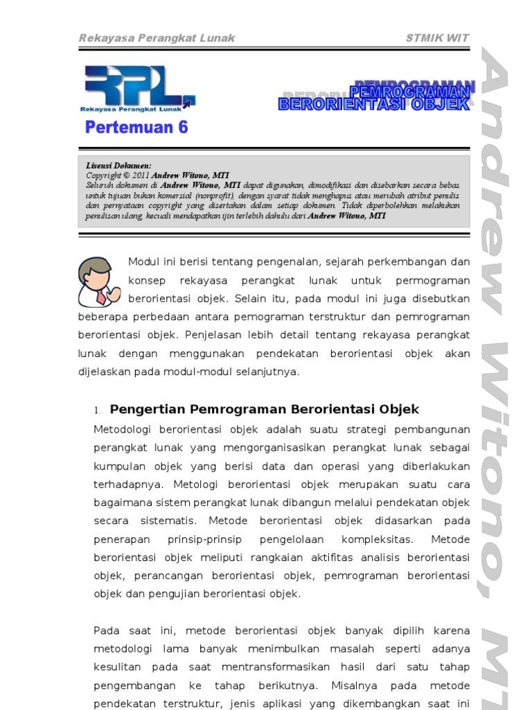 Modul ini berisi tentang pengenalan, sejarah perkembangan dan konsep rekayasa perangkat lunak untuk permograman berorientasi objek. Selain itu, pada modul ini juga disebutkan beberapa perbedaan antara pemograman terstruktur dan pemrograman berorientasi objek. Penjelasan lebih detail tentang rekayasa perangkat lunak dengan menggunakan pendekatan berorientasi objek akan dijelaskan pada modul-modul selanjutnya. 1. Pengertian Pemrograman Berorientasi Objek Metodologi berorientasi objek adalah suatu strategi pembangunan perangkat lunak yang mengorganisasikan perangkat lunak sebagai kumpulan objek yang berisi data dan operasi yang diberlakukan terhadapnya. Metologi berorientasi objek merupakan suatu cara bagaimana sistem perangkat lunak dibangun melalui pendekatan objek secara sistematis. Metode berorientasi pengelolaan objek didasarkan pada penerapan prinsip-prinsip kompleksitas. Metode