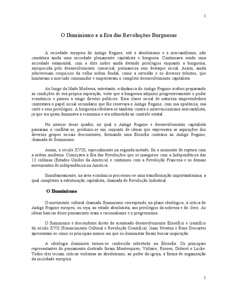 O movimento cultural chamado Iluminismo corresponde, no plano ideolgico, critica do Antigo Regime europeu, ou seja, ao estado absolutista, aos privilgios da nobreza e do clero. As idias bsicas desse pensamento eram o racionalismo e o progressismo. O Iluminismo descendente direto do acentuado desenvolvimento filosfico e cientifico do sculo XVII (Renascimento Cultural e Revoluo Cientifica). Isaac Newton e Ren Descartes apresentam-se como os principais nomes em que os iluministas foram buscar inspirao. A ideologia iluminista tornou-se conhecida sobretudo na filosofia. Os principais representantes do pensamento ilustrado foram Montesquieu, Voltaire, Rosseu, Diderot e Locke. Todos eles teciam crticas violentas ao absolutismo, ao poder da igreja, forma de organizao da sociedade europia.