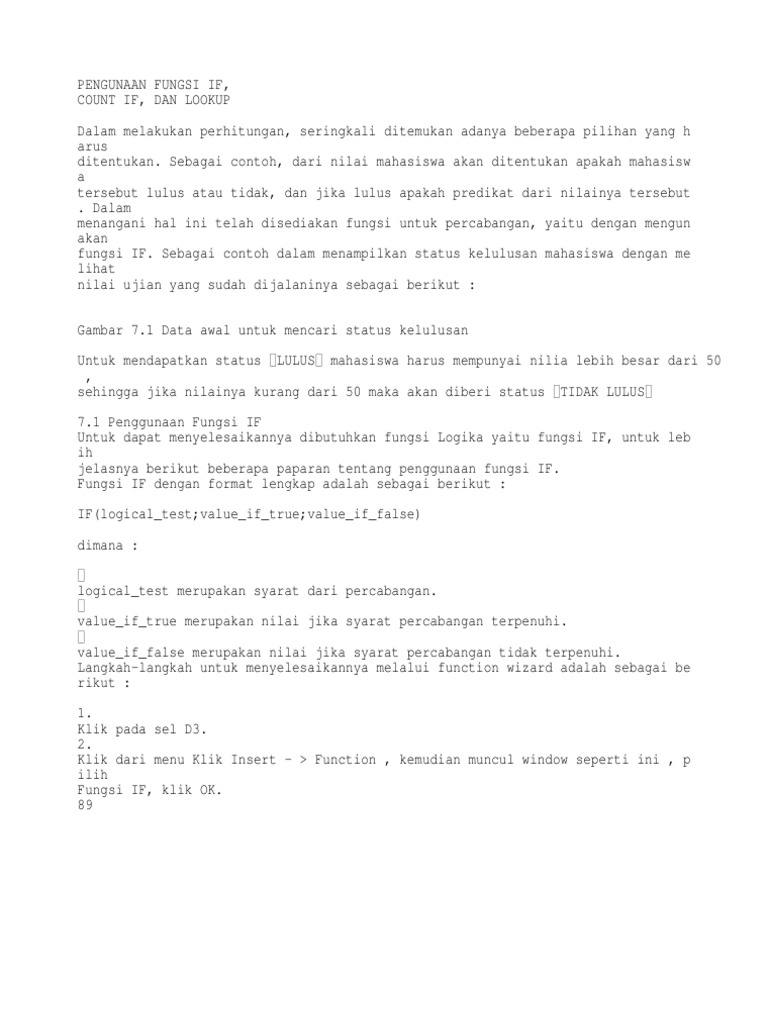 yang h arus ditentukan. Sebagai contoh, dari nilai mahasiswa akan ditentukan apakah mahasisw a tersebut lulus atau tidak, dan jika lulus apakah predikat dari nilainya tersebut . Dalam menangani hal ini telah disediakan fungsi untuk percabangan, yaitu dengan mengun akan fungsi IF. Sebagai contoh dalam menampilkan status kelulusan mahasiswa dengan me lihat nilai ujian yang sudah dijalaninya sebagai berikut : Gambar 7.1 Data awal untuk mencari status kelulusan Untuk mendapatkan status LULUS mahasiswa harus mempunyai nilia lebih besar dari 50 , sehingga jika nilainya kurang dari 50 maka akan diberi status TIDAK LULUS 7.1 Penggunaan Fungsi IF Untuk dapat menyelesaikannya dibutuhkan fungsi Logika yaitu fungsi IF, untuk leb ih jelasnya berikut beberapa paparan tentang penggunaan fungsi IF. Fungsi IF dengan format lengkap adalah sebagai berikut : IF(logical_test;value_if_true;value_if_false) dimana : logical_test merupakan syarat dari percabangan. value_if_true merupakan nilai jika syarat percabangan terpenuhi. value_if_false merupakan nilai jika syarat percabangan tidak terpenuhi. Langkah-langkah untuk menyelesaikannya melalui function wizard adalah sebagai be rikut : 1. Klik pada sel D3. 2. Klik dari menu Klik Insert - > Function , kemudian muncul window seperti ini , p ilih Fungsi IF, klik OK. 89