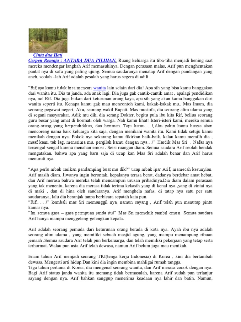 mereka mendengar langkah Arif memasukinya. Dengan perasaan malas, Arif pun menghentakan pantat nya di sofa yang paling ujung. Semua saudaranya menatap Arif dengan pandangan yang aneh, seolah lah Arif adalah pesalah yang harus segera di adili. Rif,apa kamu tidak bisa mencari wanita lain selain dari dia! Apa sih yang bisa kamu banggakan dari wanita itu. Dia tu janda, ada anak lagi. Dia juga gak cantik-cantik amat , apalagi pendidikan nya, nol Rif. Dia juga bukan dari keturunan orang kaya, apa sih yang akan kamu banggakan dari wanita seperti itu. Kenapa kamu gak mau mencontoh kami, kakak-kakak mu.. Mas Imam, dia seorang pegawai negeri, Aku, seorang wakil Bupati. Mas mustofa, dia seorang alim ulama yang di segani masyarakat. Adik mu dik, dia serang Dokter, begitu pula ibu kita Rif, beliua seorang guru besar yang amat di hormati oleh warga. Nah kamu lihat! Isteri-isteri kami, mereka semua orang-orang yang berpendidikan, dan beriman. Tapi kamu..!,Aku yakin kamu hanya akan mencoreng nama baik keluarga kita saja, dengan menikahi wanita itu. Kami tidak setuju kamu menikah dengan nya. Pokok nya sekarang kamu fikirkan baik-baik, kalau kamu memilh dia , maaf kami tak lagi menerima mu, pergilah kamu dengan nya! Hardik Mas Sri. . Nafas nya tersengal-sengal karena menahan emosi . Seisi ruangan diam. Semua saudara Arif seolah hendak mengatakan, bahwa apa yang baru saja di ucap kan Mas Sri adalah benar dan Arif harus menuruti nya. Apa perlu mbak carikan pendamping buat mu dik? ucap mbak ipar Arif, memecah kesunyian. Arif masih diam. Jiwanya ingin berontak, kepalanya terasa berat, dadanya berdebar amat hebat, dan Arif merasa bahwa mereka telah mencampuri urusan [Link] diam dalam perasaan yang tak menentu, karena dia merasa tidak terima kekasih yang di kenal nya ,yang di cintai nya di maki , dan di hina oleh saudaranya. Arif menghela nafas, di tatap nya satu per satu saudaranya, lalu dia beranjak tanpa berbicara sepatah kata pun. Rif! kembali mas Sri memanggil nya, namun sayang , Arif telah pun menutup pintu kamar nya. Ini semua gara gara permpuan janda itu! Mas Sri memekik sambil emosi. Semua saudara Arif hanya mampu menggeleng-gelengkan kepala. Arif adalah seorang pemuda dari keturunan orang berada di kota nya. Ayah ibu nya adalah seorang alim ulama , yang memiliki sebuah masjid agung, yang mampu menampung ribuan jemaah .Semua saudara Arif telah pun berkeluarga, dan telah memiliki pekerjaan yang tetap serta terhormat. Walau pun usia Arif telah dewasa, namun Arif belum juga mau menikah. Enam tahun Arif menjadi seorang TKI(tenga kerja Indonesia) di Korea , kini dia bertambah dewasa. Mengerti arti [Link] kini dia ingin membina mahligai rumah tangga. Tiga tahun pertama di Korea, dia mengenal seorang wanita, dan Arif merasa cocok dengan nya. Bagi Arif status janda wanita itu memang tidak bermasalah, karena Arif sudah pun terlanjur sayang dengan nya. Arif bahkan sanggup menerima keadaan nya lahir dan batin. Namun,