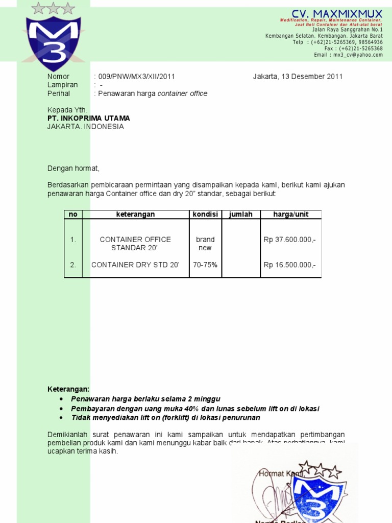 : 009/PNW/MX3/XII/2011 : : Penawaran harga container office