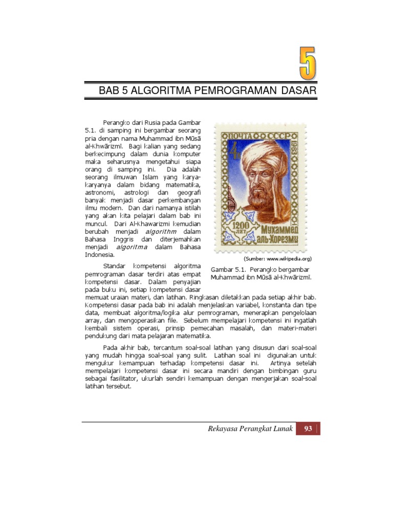 Standar kompetensi algoritma Gambar 5.1. Perangko bergambar pemrograman dasar terdiri atas empat Muhammad ibn Ms al-Khwrizm. kompetensi dasar. Dalam penyajian pada buku ini, setiap kompetensi dasar memuat uraian materi, dan latihan. Ringkasan diletakkan pada setiap akhir bab. Kompetensi dasar pada bab ini adalah menjelaskan variabel, konstanta dan tipe data, membuat algoritma/logika alur pemrograman, menerapkan pengelolaan array, dan mengoperasikan file. Sebelum mempelajari kompetensi ini ingatlah kembali sistem operasi, prinsip pemecahan masalah, dan materi-materi pendukung dari mata pelajaran matematika. Pada akhir bab, tercantum soal-soal latihan yang disusun dari soal-soal yang mudah hingga soal-soal yang sulit. Latihan soal ini digunakan untuk mengukur kemampuan terhadap kompetensi dasar ini. Artinya setelah mempelajari kompetensi dasar ini secara mandiri dengan bimbingan guru sebagai fasilitator, ukurlah sendiri kemampuan dengan mengerjakan soal-soal latihan tersebut.