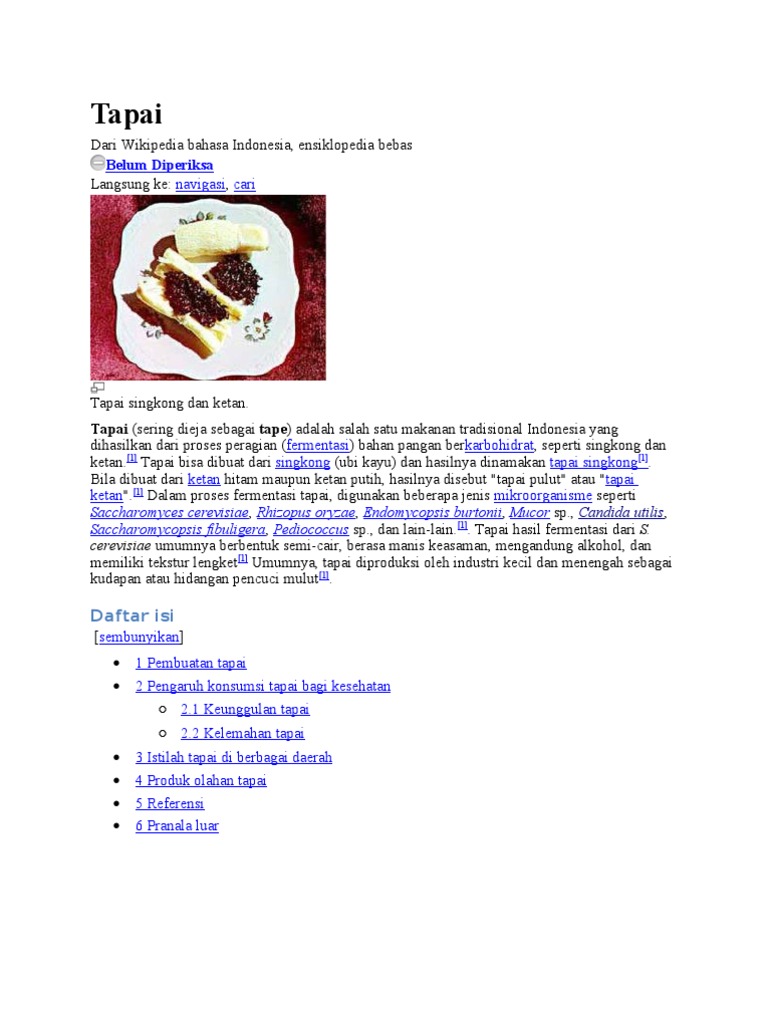 yang bersifat toksik dalam tubuh manusia.[4]. Konsumsi tapai dapat mencegah terjadinya anemia karena mikroorganisme yang berperan dalam fermentasinya mampu menghasilkan vitamin B12[5] [sunting] Kelemahan tapai Konsumsi tapai yang berlebihan dapat menimbulkan infeksi pada darah dan gangguan sistem pencernaan. Selain itu, beberapa jenis bakteri yang digunakan dalam pembuatan tapai berpotensi menyebabkan penyakit pada orang-orang dengan sistem imun yang terlalu lemah seperti anakanak balita, kaum lanjut usia, atau penderita HIV3. Untuk mengurangi dampak negatif tersebut, konsumsi tapai perlu dilakukan secara terkendali dan pembuatannya serta penyimpanannya pun dilakukan dengan higienis.[2]