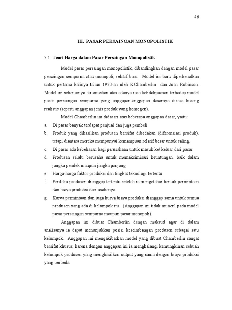 III. PASAR PERSAINGAN MONOPOLISTIK 3.1. Teori Harga dalam Pasar Persaingan Monopolistik Model pasar persaingan monopolistik, dibandingkan dengan model pasar persaingan sempurna atau monopoli, relatif baru. Model ini baru diperkenalkan untuk pertama kalinya tahun 1930-an oleh E.Chamberlin dan Joan Robinson. Model ini sebenarnya dirumuskan atas adanya rasa ketidakpuasan terhadap model pasar persaingan sempurna yang anggapan-anggapan dasarnya dirasa kurang realistis (seperti anggapan jenis produk yang homogen). Model Chamberlin ini didasari atas beberapa anggapan dasar, yaitu: a. b. c. d. e. f. g. Di pasar banyak terdapat penjual dan juga pembeli Produk yang dihasilkan produsen bersifat dibedakan (diferensiasi produk), tetapi diantara mereka mempunyai kemampuan relatif besar untuk saling. Di pasar ada kebebasan bagi perusahaan untuk masuk ke/ keluar dari pasar. Produsen selalu berusaha untuk memaksimisasi keuntungan, baik dalam jangka pendek maupun jangka panjang Harga-harga faktor produksi dan tingkat teknologi tertentu Perilaku produsen dianggap tertentu setelah ia mengetahui bentuk permintaan dan biaya produksi dari usahanya Kurva permintaan dan juga kurva biaya produksi dianggap sama untuk semua produsen yang ada di kelompok itu. (Anggapan ini tidak muncul pada model pasar persaingan sempurna maupun pasar monopoli). Anggapan ini dibuat Chamberlin dengan maksud agar di dalam analisanya ia dapat menunjukkan posisi keseimbangan produsen sebagai satu kelompok. Anggapan ini mengakibatkan model yang dibuat Chamberlin sangat bersifat khusus, karena dengan anggapan ini ia menghalangi kemungkinan sebuah kelompok produsen yang menghasilkan output yang sama dengan biaya produksi yang berbeda.