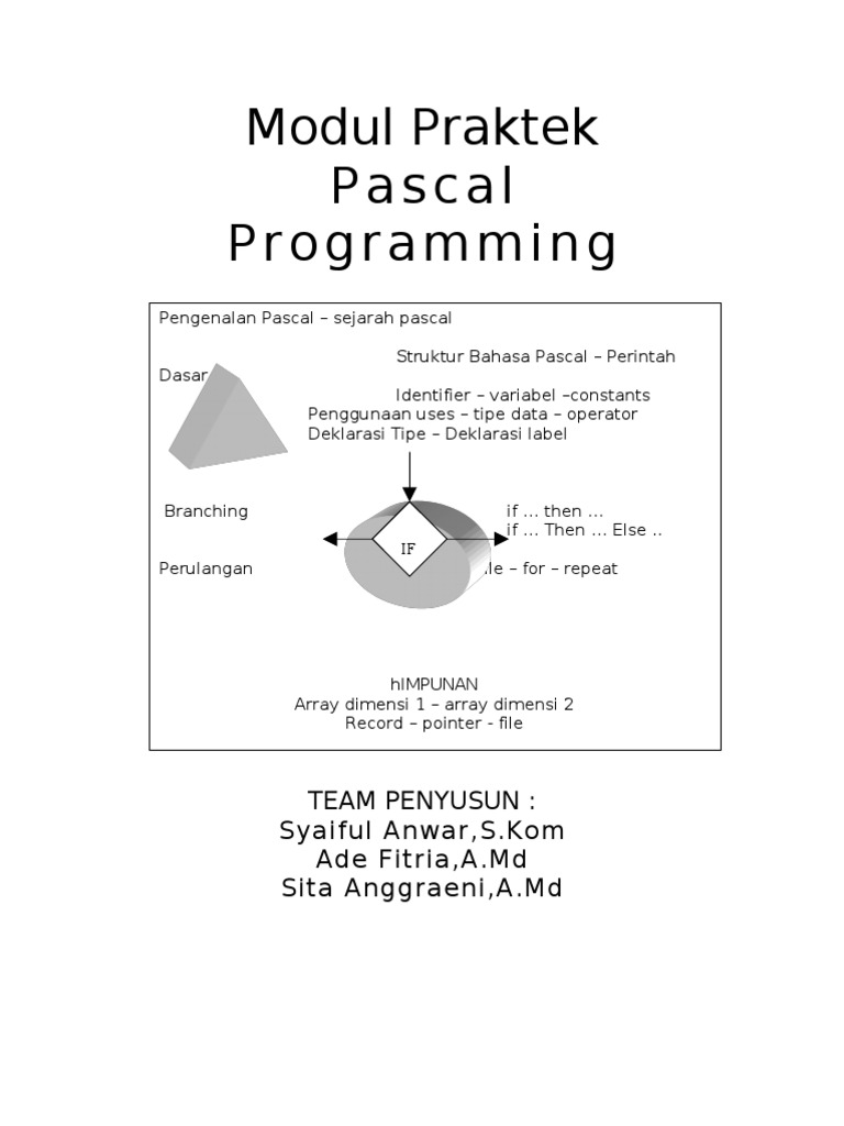 Pengenalan Pascal sejarah pascal Struktur Bahasa Pascal Perintah Dasar Identifier variabel constants Penggunaan uses tipe data operator Deklarasi Tipe Deklarasi label