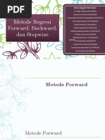 Regresi Stepwise merupakan salah satu metode untuk mengatasi adanya kasus multikolinieritas, yaitu suatu kondisi dimana terjadi korelasi yang kuat diantara variabel-variabel bebas (X). Untuk mendeteksi adanya kasus multikolinieritas dapat dilihat dari besarnya nilai VIF yang lebih dari 10. Metode Stepwise merupakan gabungan dari metode backward elimination dan forward selection, untuk itu akan dibahas metode backward elimination, forward selection, dan stepwise regression. Metode Backward Elimination Metode backward bekerja dengan mengeluarkan satu per satu variabel prediktor yang tidak signifikan dan dilakukan terus menerus sampai tidak ada variabel prediktor yang tidak signifikan, langkah-langkah metode backward adalah sebagai berikut :