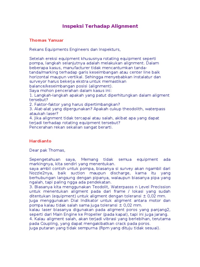 Itu saja, semoga membantu Mohon di croscek kalau salah firman aris Bapak Thomas, Memang biasanya tanda-tanda/ marking terhadap garis keseimbangan atau center line baik horizontal maupun vertikal tidak ada. Sehingga menyebabkan instalatur dan surveyor harus bekerja ekstra untuk memastikan balance/keseimbangan posisi. Reference diambil pada bagian yang datar misalkan di baseplate, motor / pompa, flange. Dengan memakai waterpass diambil arah sumbu x dan y. Sebaiknya ada dua titik misalkan sebelah kanan dan kiri. Apabila equipment akan digrouting maka sebelumnya harus diukur dulu pada waktu padding baik menggunakan waterpass (x dan y) maupun theodolit (z). Baru di grouting. syamsul_an@pusri Pak Thomas, Untuk instalasi rotating equipment, bapak bisa mengacu ke API RP 686, mRecommended Practices for Machinery Installation and Installation Design. Semoga dpt membantu. henky Taro Dear Pak Thomas, Jawaban saya ada disetiap pertanyaan bapak dalam mudah-mudahan berguna. Rekans Equipments Engineers dan Inspekturs, Setelah ereksi equipment khususnya rotating equipment seperti pompa, langkah selanjutnya adalah melakukan alignment. Dalam
