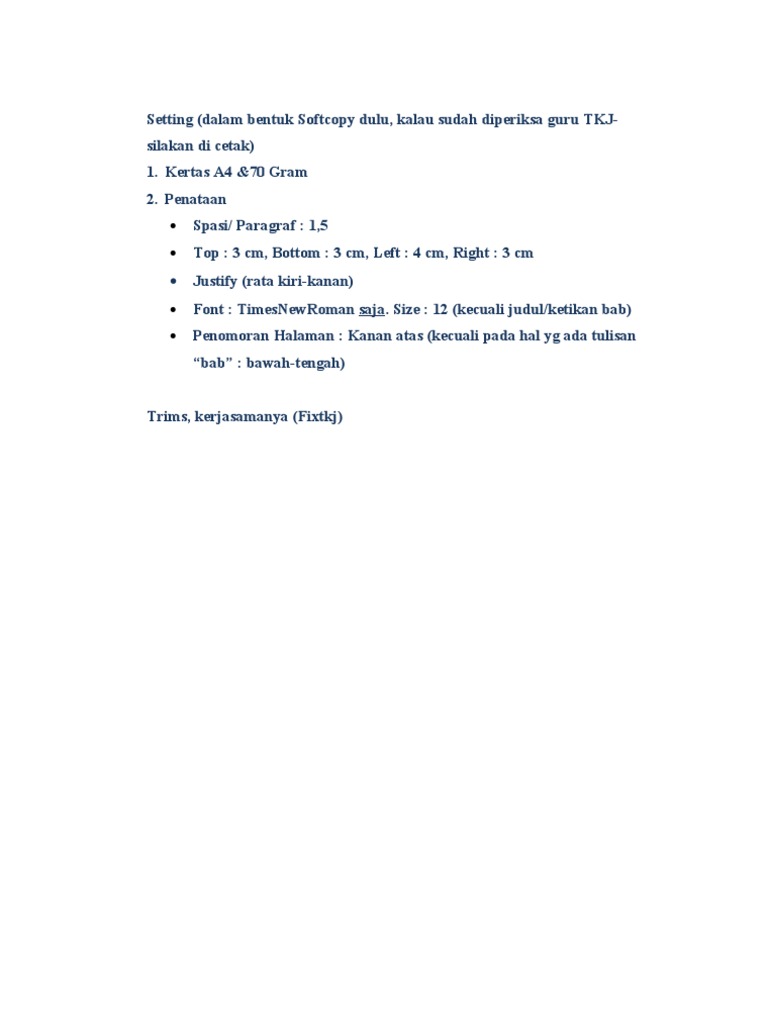Setting (dalam bentuk Softcopy dulu, kalau sudah diperiksa guru TKJsilakan di cetak) 1. Kertas A4 &70 Gram 2.