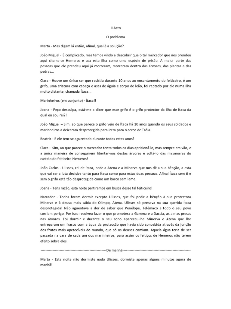 ? Joo Miguel - complicado, mas temos vindo a descobrir que o tal mercador que nos prendeu aqui chama-se Hemeros e usa esta ilha como uma espcie de priso. A maior parte das pessoas que ele prendeu aqui j morreram, morreram dentro das rvores, das plantas e das pedras... Clara - Houve um nico ser que resistiu durante 10 anos ao encantamento do feiticeiro, um grifo, uma criatura com cabea e asas de guia e corpo de leo, foi raptado por ele numa ilha muito distante, chamada taca... Marinheiros (em conjunto) - taca!! Joana - Peo desculpa, est-me a dizer que esse grifo o grifo protector da ilha de taca da qual eu sou rei?! Joo Miguel Sim, ao que parece o grifo veio de taca h 10 anos quando os seus soldados e marinheiros a deixaram desprotegida para irem para o cerco de Tria. Beatriz - E ele tem-se aguentado durante todos estes anos? Clara Sim, ao que parece o mercador tenta todos os dias aprision-lo, mas sempre em vo, e a nica maneira de conseguirem libertar-nos destas rvores solt-lo das masmorras do castelo do feiticeiro Hemeros! Joo Carlos - Ulisses, rei de taca, pede a Atena e a Minerva que nos d a sua bno, a esta que vai ser a luta decisiva tanto para taca como para estas duas pessoas. Afinal taca sem ti e sem o grifo est to desprotegida como um barco sem leme. Joana - Tens razo, esta noite partiremos em busca desse tal feiticeiro! Narrador - Todos foram dormir excepto Ulisses, que foi pedir a bno sua protectora Minerva e deusa mais sbia do Olimpo, Atena. Ulisses s pensava na sua querida taca desprotegida! No aguentava a dor de saber que Penlope, Telmaco e todo o seu povo corriam perigo. Por isso resolveu fazer o que prometera a Gamma e a Daccia, as almas presas nas rvores. Foi dormir e durante o seu sono apareceu-lhe Minerva e Atena que lhe entregaram um frasco com a gua da proteco que havia sido concebida atravs da juno dos frutos mais apetecveis do mundo, que s os deuses comiam. Aquela gua teria de ser passada na cara de cada um dos marinheiros, para assim os feitios de Hemeros no terem efeito sobre eles. -------------------------------------------------------De manh--------------------------------------------------------Marta - Esta noite no dormiste nada Ulisses, dormiste apenas alguns minutos agora de manh!