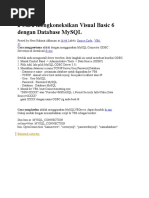 Selain cara koneksi model DSN, Anda dapat melakukan koneksi dari Visual Basic ke database MySQL dengan model Connection String. Ikutilah langkah-langkah di bawah ini. 1. 2. 3. 4. 5. Buatlah GUI dengan menambahkan sebuah control adodc dan datagrid Hubungkan DataGrid ke adodc pada properti DataSource Klik kanan Adodc1 > ADODC Properties Klik Use Connection String > Build Pilih Microsoft OLE DB Provider for ODBC Drivers > Next