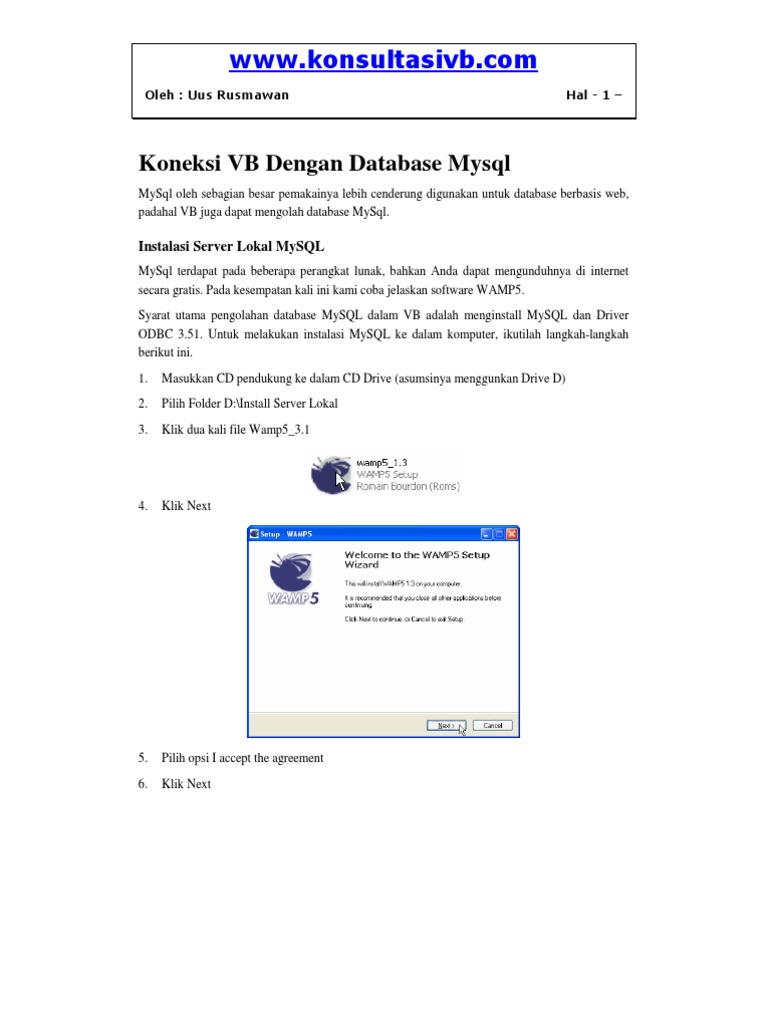 MySql terdapat pada beberapa perangkat lunak, bahkan Anda dapat mengunduhnya di internet secara gratis. Pada kesempatan kali ini kami coba jelaskan software WAMP5. Syarat utama pengolahan database MySQL dalam VB adalah menginstall MySQL dan Driver ODBC 3.51. Untuk melakukan instalasi MySQL ke dalam komputer, ikutilah langkah-langkah berikut ini. 1. 2. 3. Masukkan CD pendukung ke dalam CD Drive (asumsinya menggunkan Drive D) Pilih Folder D:\Install Server Lokal Klik dua kali file Wamp5_3.1