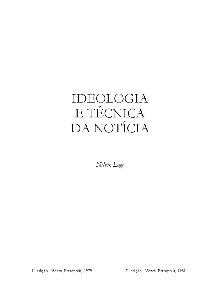 Ler textos nossos, antigos, como tirar da gaveta um retratos nossos, antigos: temos a ntida impresso de que estamos ali, mas a certeza de que j no estamos mais ali. Ainda assim, a ocasio me permite lembrar o passado deste texto, que agora apresento, quase 20 anos depois, terceira edio. Ele foi lanado discretamente, em 1979, e, por um ano ou dois, tive a impresso de que ningum o lera. S mais tarde, sada e quase esgotada a segunda edio, notei que, afinal, tivera leitores, fazia algum sucesso. Por que? Porque gerou crticas, algumas veementes, e no se critica o irrelevante. Depois, veio a fase da copiagem eletrosttica. No estando mais o livro venda, nem sendo novidade que valia a pena retaliar, continuou aparecendo na bibliografia de concursos pblicos e cursos variados, com o que cada exemplar multiplicou-se em muitos mais nas mquinas xerox. Lembro-me de um colega que, na Universidade de Braslia, mostrou-me um armrio cheio de cpias da Ideologia e Tcnica da Notcia. Por que voc no o reedita?, perguntou-me. Basicamente, porque estava ocupado com outras coisas. Mais com semntica do que com sintaxe. Mais com o acompanhamento dos avanos tecnolgicos da imprensa do que com questes gerais de semiologia. Mais em difundir conhecimento do que em aprofund-lo. Em 1987, surgiu um livro importante, O segredo da pirmide, de Adelmo Genro 1. Filho , que, para formular sua anlise a partir de modelos da dialtica de Hegel, cita constantemente a Ideologia e contesta algumas de suas colocaes, propondo, particularmente, a autonomia do discurso jornalstico como aquele que, a partir da singularidade, pretende alcanar a universalidade, sem a intermediao do conhecimento particular, especializado, to relevante em nossa cultura. Adelmo morreu cedo - era jovem e no tive oportunidade nem de trocar idias com ele. Agora, meu colega Eduardo Meditsch prope-me a reedio. Fiz uma reviso cuidadosa do texto: 1. No primeiro captulo, procurei atualizar as informaes sobre a indstria grfica, sem suprimir o que constava como atual (a impresso a quente, a composio tica ou em linotipos) e que hoje arqueolgico. Acrescentei breves comentrios sobre os fatos que transcorreram aps a dcada de 70: ainda a, a sensao de que tudo mudou, mas tudo continua a mesma coisa. Em termos crticos, nota-se nesse captulo, e mais adiante, no livro, influncia grande - e boa - de Roland Barthes, que me parece o autor mais consistente do estruturalismo francs -, se que Barthes pode ser reduzido condio de estruturalista. Percebe-se a presuno de iniciante: querer dizer tudo de uma vez s. E um vcio de jornalista: nomes, dados, fatos, documentao para tudo.