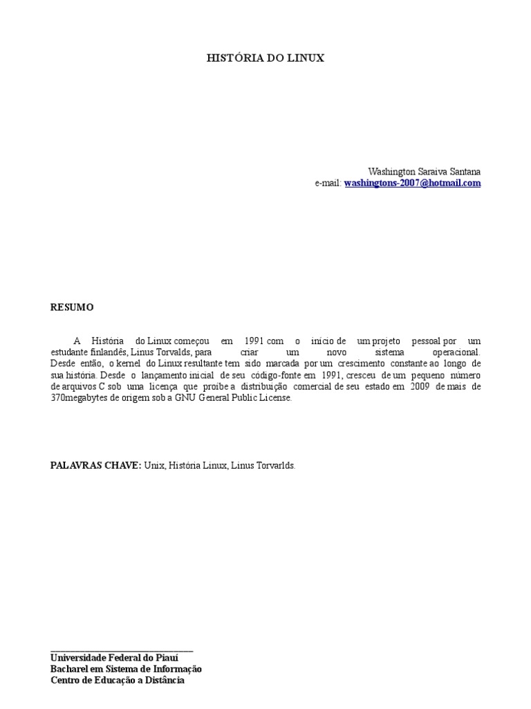 RESUMO A Histria do Linux comeou em 1991 com o incio de um projeto pessoal por um estudante finlands, Linus Torvalds, para criar um novo sistema operacional. Desde ento, o kernel do Linux resultante tem sido marcada por um crescimento constante ao longo de sua histria. Desde o lanamento inicial de seu cdigo-fonte em 1991, cresceu de um pequeno nmero de arquivos C sob uma licena que probe a distribuio comercial de seu estado em 2009 de mais de 370megabytes de origem sob a GNU General Public License.