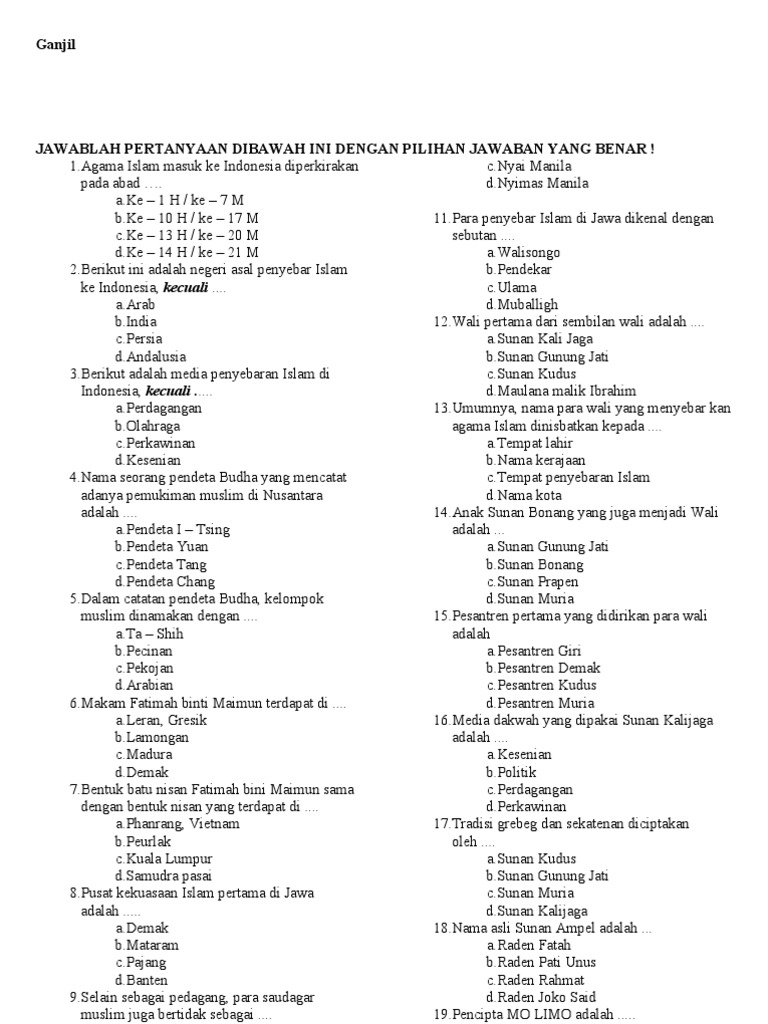 JAWABLAH PERTANYAAN DIBAWAH INI DENGAN PILIHAN JAWABAN YANG BENAR ! 1.Agama Islam masuk ke Indonesia diperkirakan c.Nyai Manila pada abad . d.Nyimas Manila a.Ke 1 H / ke 7 M b.Ke 10 H / ke 17 M 11.Para penyebar Islam di Jawa dikenal dengan c.Ke 13 H / ke 20 M sebutan .... d.Ke 14 H / ke 21 M a.Walisongo 2.Berikut ini adalah negeri asal penyebar Islam b.Pendekar ke Indonesia, kecuali .... c.Ulama a.Arab d.Muballigh b.India 12.Wali pertama dari sembilan wali adalah .... c.Persia a.Sunan Kali Jaga d.Andalusia b.Sunan Gunung Jati 3.Berikut adalah media penyebaran Islam di c.Sunan Kudus Indonesia, kecuali ..... d.Maulana malik Ibrahim a.Perdagangan 13.Umumnya, nama para wali yang menyebar kan b.Olahraga agama Islam dinisbatkan kepada .... c.Perkawinan a.Tempat lahir d.Kesenian b.Nama kerajaan 4.Nama seorang pendeta Budha yang mencatat c.Tempat penyebaran Islam adanya pemukiman muslim di Nusantara d.Nama kota adalah .... 14.Anak Sunan Bonang yang juga menjadi Wali a.Pendeta I Tsing adalah ... b.Pendeta Yuan a.Sunan Gunung Jati c.Pendeta Tang b.Sunan Bonang d.Pendeta Chang c.Sunan Prapen 5.Dalam catatan pendeta Budha, kelompok d.Sunan Muria muslim dinamakan dengan .... 15.Pesantren pertama yang didirikan para wali a.Ta Shih adalah b.Pecinan a.Pesantren Giri c.Pekojan b.Pesantren Demak d.Arabian c.Pesantren Kudus 6.Makam Fatimah binti Maimun terdapat di .... d.Pesantren Muria a.Leran, Gresik 16.Media dakwah yang dipakai Sunan Kalijaga b.Lamongan adalah .... c.Madura a.Kesenian d.Demak b.Politik 7.Bentuk batu nisan Fatimah bini Maimun sama c.Perdagangan dengan bentuk nisan yang terdapat di .... d.Perkawinan a.Phanrang, Vietnam 17.Tradisi grebeg dan sekatenan diciptakan b.Peurlak oleh .... c.Kuala Lumpur a.Sunan Kudus d.Samudra pasai b.Sunan Gunung Jati 8.Pusat kekuasaan Islam pertama di Jawa c.Sunan Muria adalah ..... d.Sunan Kalijaga a.Demak 18.Nama asli Sunan Ampel adalah ... b.Mataram a.Raden Fatah c.Pajang b.Raden Pati Unus d.Banten c.Raden Rahmat 9.Selain sebagai pedagang, para saudagar d.Raden Joko Said muslim juga bertidak sebagai .... 19.Pencipta MO LIMO adalah ..... a.Juru dakwah a.Sunan Kudus b.Pembeli b.Sunan Gunung Jati c.Juru kunci c.Sunan Ampel d.Raja d.Sunan Giri 10.Nama istri Sunan Gunung Jati adalah .... 20.Hamzah Fansuri berasal dari daerah .... a.Putri Kawungaten a.Fansur b.Putri Campa b.Peurlak