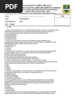 JAWABLAH PERTANYAAN DIBAWAH INI DENGAN PILIHAN JAWABAN YANG BENAR ! 1. Sebelum Islam datang, kebudayaan Nusantara Islam adalah menara Masjid Kudus, Jawa didominasi oleh kebudayaan ........ tengah. Nama asli Masjid Kudus adalah ...... a.Hindu Budha a.Masjid Baiturrohim b.Jawa b.Masjid Al Aqsa c.Arab /Islam c.Masjid Baitul Maqdis d.Eropa d.Masjid Menara Kudus 2. Salah satu rekayasa arsitektur yang dianggap 9. Menara Masjid kudus memiliki ketinggian ...... dari tradisi megalitik/prasejarah adalah ....... a.16 m a.Bangunan Masjid b.17 m b.Bangunan teras berundak c.18 m c.Bangunan monumen d.19 m d.Bangunan sekolah 10. Luas menara Masjid Kudus adalah ....... 3. Dibawah ini merupakan beberapa jenis unsur a.100 m megalit yang berasosiasi/ bergabung dengan b.101 m bangunan teras berundak , kecuali....... c.102 m a.Menhir d.103 m b.Arca batu 11. Nama lain dari Kraton atau istana adalah ...... c.Batu lumpang a.Sanggar d.Lumpang besi b.Puri 4. Islam di Nusantara disosialisasikan dengan c.Surau cara ..... d.Panggung a.Ekstrem/kekerasan 12. Kaligrafi merupakan salah satu bagian dari b.Pemaksaan seni menulis, istilah ini dalam bahasa arab c.Damai disebut khat, yang artinya ..... d.Perang a.Hiasan indah 5. Para penyebar Islam di Nusantara memilih b.Tulisan indah berbagai budaya lokal sebagai media c.Garis indah komunikasi, diantaranya ..... d.Gambar indah a.Wayang ,gamelan, tembang dan seni 13. Dibawah ini merupakan contoh letak bentuk ukir tulisan atau epigrafi Islam nusantara yang b.Kuda lumping, orkes melayu, reog dipengaruhi oleh budaya budaya asing, c.Band religi, ludruk, ketoprak kecuali ..... d.Irama padang pasir, japin a.Di makam Fathhimah binti Maimun 6. Proses adaptasi Islam ke dalam budaya etnik (Leran, Gresik) lokal dilakukan dengan mengubah ragam hias b.Di makam Maulana Malik Ibrahim Islam, seperti ..... (Gresik) a.Kaligrafi ke dalam bentuk gejala alam c.Di makam Sultan Nahrisyah (Pasai, (Flora dan Fauna) Aceh Utara) b.Bangunan masjid menjadi vihara d.Di makam Sunan Ampel (Surabaya) c.Bangunan dari batu ke kayu 14. Tari Saman merupakan salah satu tarian d.Kaligrafi ke dalam bentuk arca/patung tradisional Meelayu yang berasal dari daerah.... 7. Seseorang yang ahli dalam kegiatan seni a.Pati, Jawa Tengah budaya (seniman),yang mampu menciptakan b.Cirebon Jawa Barat karya seni dan ahli dalam bidang ilmu c.Gayo, Aceh Tenggara pengetahuan dan filsafat di sebut .... d.Pacitan, Jawa Timur a.Dalang 15. Tari Saman diciptakan dan dikembangkan oleh b.Artis seeorang Ulama penyebar agama Islam yang c.Empu bernama ... d.Tabib a.Syekh Abdul Qodir Al Jailani 8. Salah satu bentuk arsitektur masjid yang b.Syekh Saman merupakan hasil proses akulturasi seni c.Syekh Subakir bangunan Jawa Hindu dengan arsitektur d.Syekh Abdullah Al Haddad