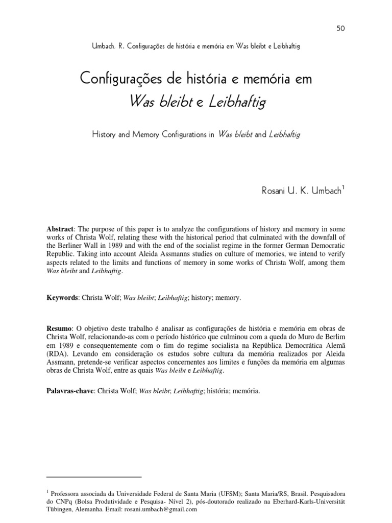 Umbach, R. Configurações de história e memória em Was bleibt e Leibhaftig