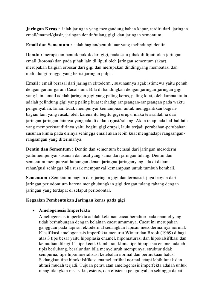 dan jaringan sementum. Email dan Sementum : ialah bagian/bentuk luar yang melindungi dentin. Dentin : merupakan bentuk pokok dari gigi, pada satu pihak di liputi oleh jaringan email (korona) dan pada pihak lain di liputi oleh jaringan sementum (akar), merupakan baigian erbesar dari gigi dan merupakan dindingyang membatasi dan melindungi rongga yang berisi jaringan pulpa. Email : email berasal dari jaringan ektoderm , susunannya agak istimewa yaitu penuh dengan garam-garam Cacalsium. Bila di bandingkan dengan jaringan-jaringan gigi yang lain, email adalah jaringan gigi yang paling keras, paling kuat, oleh karena itu ia adalah pelindung gigi yang paling kuat terhadap rangsangan-rangsangan pada waktu pengunyahan. Email tidak mempunyai kemampuan untuk menggantikan bagianbagian lain yang rusak, oleh karena itu begitu gigi erupsi maka terisahlah ia dari jaringan-jaringan lainnya yang ada di dalam rgusi/rahang. Akan tetapi ada hal-hal lain yang memperkuat dirinya yaitu begitu gigi erupsi, laulu terjadi perubahan-perubahan susunan kimia pada dirinya sehingga email akan lebih kuat menghadapi rangsanganrangsangan yang diterimanya. Dentin dan Sementum : Dentin dan sementum berasal dari jaringan mesoderm yaitumempunyai susunan dan asal yang sama dari jaringan tulang. Dentin dan sementum mempunyai hubungan denan jaringna-jaringanyang ada di dalam rahan/gusi sehingga bila rusak mempunyai kemampuan untuk tumbuh kembali. Sementum : Sementum bagian dari jaringan gigi dan termasuk juga bagian dari jaringan periodontium karena menghubungkan gigi dengan tulang rahang dengan jaringan yang terdapat di selaput periodontal. Kegaalan Pembentukan Jaringan keras pada gigi Amelogenesis Imperfekta Amelogenesis imperfekta adalah kelainan cacat herediter pada enamel yang tidak berhubungan dengan kelainan cacat umumnya. Cacat ini merupakan gangguan pada lapisan ektodermal sedangkan lapisan mesodermalnya normal. Klasifikasi amelogenesis imperfekta menurut Winter dan Brook (1969) dibagi atas 3 tipe besar yaitu hipoplasia enamel, hipomaturasi dan hipokalsiflkasi dan kemudian dibagi 11 tipe kecil. Gambaran klinis tipe hipoplasia enamel adalah tipis berlubang, beralur dan bila menyeluruh mempunyai struktur tidak sempurna, tipe hipomineralisasi ketebalan normal dan permukaan halus. Sedangkan tipe hipokalslfikasi enamel terlihal normal tetapi lebih lunak dan abrasi mudah terjadi. Tujuan perawatan amelogenesis imperfekta adalah unluk menghilangkan rasa sakit, estetis, dan efisiensi pengunyahan sehingga dapat