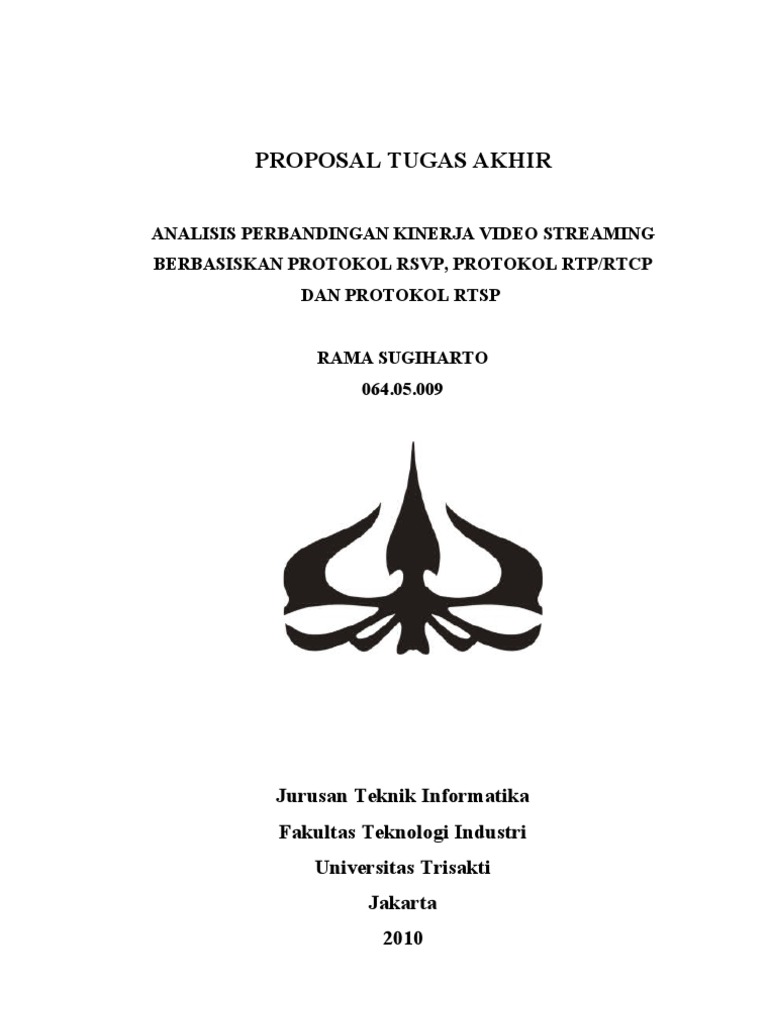 JURUSAN TEKNIK INFORMATIKA FAKULTAS TEKNOLOGI INDUSTRI UNIVERSITAS TRISAKTI USULAN TUGAS AKHIR Nama NIM Peminatan Judul Tugas Akhir : Rama Sugiharto : 06405009 : Jaringan Komputer : Analisis Perbandingan Kinerja Video Streaming Berbasiskan Protokol RSVP, Protokol RTP/RTCP dan Protokol RTSP Pembimbing I Pembimbing II: Dilaksanakan : Semester Genap 2009/2010 : Ir. Adrian Sjamsul Qamar, MTI