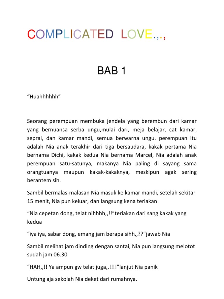 Seorang perempuan membuka jendela yang berembun dari kamar yang bernuansa serba ungu,mulai dari, meja belajar, cat kamar, seprai, dan kamar mandi, semua berwarna ungu. perempuan itu adalah Nia anak terakhir dari tiga bersaudara, kakak pertama Nia bernama Dichi, kakak kedua Nia bernama Marcel, Nia adalah anak perempuan satu-satunya, makanya Nia paling di sayang sama orangtuanya maupun kakak-kakaknya, meskipun agak sering berantem sih. Sambil bermalas-malasan Nia masuk ke kamar mandi, setelah sekitar 15 menit, Nia pun keluar, dan langsung kena teriakan Nia cepetan dong, telat nihhhh,,!!teriakan dari sang kakak yang kedua iya iya, sabar dong, emang jam berapa sihh,,??jawab Nia Sambil melihat jam dinding dengan santai, Nia pun langsung melotot sudah jam 06.30 HAH,,!! Ya ampun gw telat juga,,!!!!lanjut Nia panik Untung aja sekolah Nia deket dari rumahnya.