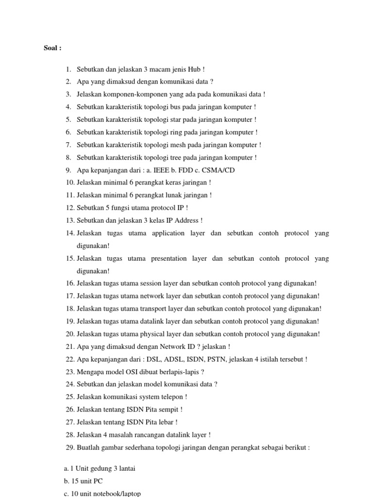 Jelaskan komponen-komponen yang ada pada komunikasi data ! 4. Sebutkan karakteristik topologi bus pada jaringan komputer ! 5. Sebutkan karakteristik topologi star pada jaringan komputer ! 6. Sebutkan karakteristik topologi ring pada jaringan komputer ! 7. Sebutkan karakteristik topologi mesh pada jaringan komputer ! 8. Sebutkan karakteristik topologi tree pada jaringan komputer ! 9. Apa kepanjangan dari : a. IEEE b. FDD c. CSMA/CD 10. Jelaskan minimal 6 perangkat keras jaringan ! 11. Jelaskan minimal 6 perangkat lunak jaringan ! 12. Sebutkan 5 fungsi utama protocol IP ! 13. Sebutkan dan jelaskan 3 kelas IP Address ! 14. Jelaskan tugas utama application layer dan sebutkan contoh protocol yang digunakan! 15. Jelaskan tugas utama presentation layer dan sebutkan contoh protocol yang digunakan! 16. Jelaskan tugas utama session layer dan sebutkan contoh protocol yang digunakan! 17. Jelaskan tugas utama network layer dan sebutkan contoh protocol yang digunakan! 18. Jelaskan tugas utama transport layer dan sebutkan contoh protocol yang digunakan! 19. Jelaskan tugas utama datalink layer dan sebutkan contoh protocol yang digunakan! 20. Jelaskan tugas utama physical layer dan sebutkan contoh protocol yang digunakan! 21. Apa yang dimaksud dengan Network ID ? jelaskan ! 22. Apa kepanjangan dari : DSL, ADSL, ISDN, PSTN, jelaskan 4 istilah tersebut ! 23. Mengapa model OSI dibuat berlapis-lapis ? 24. Sebutkan dan jelaskan model komunikasi data ? 25. Jelaskan komunikasi system telepon ! 26. Jelaskan tentang ISDN Pita sempit ! 27. Jelaskan tentang ISDN Pita lebar ! 28. Jelaskan 4 masalah rancangan datalink layer ! 29. Buatlah gambar sederhana topologi jaringan dengan perangkat sebagai berikut : a. 1 Unit gedung 3 lantai b. 15 unit PC c. 10 unit notebook/laptop d. 3 unit HUB 8 port link e. 1 unit Router f. 1 unit Switch g. 1 unit wireless link