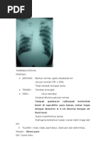CTR <50% besar dan bentuk jantung normal. Trakea ditengah. Mediastinum superior tidak melebar. Kedua hilus tidak melebar. Corakan bronkovaskuler tidak meningkat. Tak tampak infiltrat maupun nodul dikedua lapangan paru Diafragma licin, sudut costopherenicus lancip. Tulang-tulang dan jaringan lunak baik.
