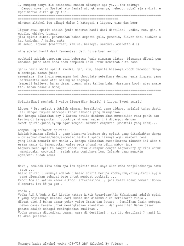 ato gk smuanya, hehe... coba2 aja sndiri, e xperimental dikit gk pp tuh.. ================================================================================ ======================================================== minuman alkohol itu dibagi dalam 3 kategori : liquor, wine dan beer liquor atau spirit adalah jenis minuman hasil dari distilasi (vodka, rum, gin, t equila, whisky, brandy) jika spirit diberi penambahan bahan seperti gula, pemanis, flavor dari buah2an a tau tumbuhan / herbs, maka di sebut liqueur (cointreau, kahlua, baileys, sambuca, amaretto dll) wine adalah hasil dari fermentasi dari juice buah anggur cocktail adalah campuran dari beberapa jenis minuman diatas, biasanya diberi pen ambahan juice atau soda atau campuran lain untuk menambah cita rasa jenis jenis white spirit (vodka, gin, rum, tequila biasanya cocok dicampur denga n berbagai macam juice) sementara jika ingin mencampur hot chocolate sebaiknya dengan jenis liqueur yang berkarakter sama atau saling melengkapi (seperti baileys, bahan dasar cream, atau kahlua bahan dasarnya kopi, atau amare tto, bahan dasar almond) ================================================================================ =========================================================================== Spiritsibagi menjadi 2 yaitu Liquor(Dry Spirit) & Liquer(Sweet spirit) Liquor / Dry spirit : Adalah minuman beralkohol yang didapat melalui tahap desti lasi dengan tujuan mencapai kadar alkohol yang diinginkan . dan kenapa dikatakan dry ? Karena ketika diminum akan memberikan rasa pahit dan kering di tenggorokan , cocoknya minuman macam ini dicampur dengan sweet spirit,juice,syrup agar menjadi minuman campuran (Cocktail yang enak)... Adapun Liquer/Sweet spirits: Adalah Minuman alkohol , yang biasanya berbase dry spirit yang ditambahkan denga n gula/buah-buahan/madu/aromatic herbs & spicy lainnya agar memberi rasa yang lebih menarik dan manis .. kenapa dikatakan sweet?karena minuman ini akan t erasa manis di tenggorokan walau pada ujung2nya bikin mabok juga . Liquer/Sweet spirits sangat cocok untuk dicampur dengan Liquor/Dry spirits untuk menciptakan cocktail , salah satu contohnya Long Islands yang mungkin agan/wati sudah kenal Next , sesudah kita tahu apa itu spirits maka saya akan coba menjelaskannya satu satu ... basic spirit : umumnya adalah 5 basic spirit berupa vodka,rum,whisky,tequila,gin yang digunakan sebagai base untuk membuat cocktail ... Proof:Adalah satuan kadar alkohol internasional , jadi kalau agan2 nemuin 10proo f berarti itu 5% ya gan . Vodka , Vodka A.K.A Voda A.K.A Little watter A.K.A Aquavitae(Air Kehidupan) adalah spiri t yang sejarahnya berasal dari Rusia dan diminum oleh Kekaisaran rusia , dibuat oleh 2 bahan dasar pokok yaitu Grain dan Potato . Pemilihan Grain sebagai bahan dasar karena untuk meningkatkan kuantitas , dan pemilihan Bahan dasar potato adalah sebagai meningkatkan kualitas , Vodka umumnya diproduksi dengan cara di destilasi , apa itu destilasi ? nanti ki ta akan jelaskan ...