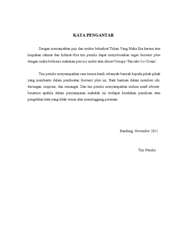 Dengan memanjatkan puji dan syukur kehadirat Tuhan Yang Maha Esa karena atas limpahan rahmat dan hidayat-Nya tim penulis dapat menyelesaikan tugas business plan dengan usaha berbisnis makanan pencuci mulut atau dessert berupa Pancake Ice Cream. Tim penulis menyampaikan rasa terima kasih sebanyak-banyak kepada pihak-pihak yang membantu dalam pembuatan business plan ini. Baik bantuan dalam memberi ide, dorongan, inspirasi, dan semangat. Dan tim penulis menyampaikan mohon maaf sebesarbesarnya apabila dalam penyampaian makalah ini terdapat kesalahan penulisan atau pengetikan kata yang tidak sesuai atau menyinggung perasaan.