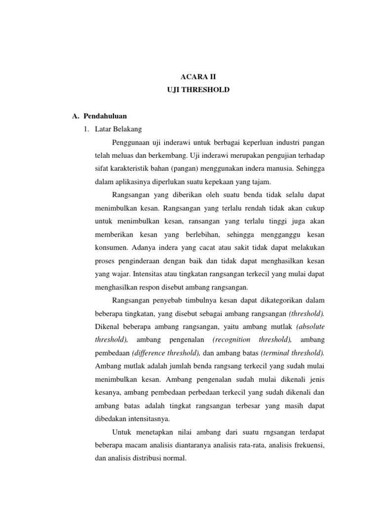 A. Pendahuluan 1. Latar Belakang Penggunaan uji inderawi untuk berbagai keperluan industri pangan telah meluas dan berkembang. Uji inderawi merupakan pengujian terhadap sifat karakteristik bahan (pangan) menggunakan indera manusia. Sehingga dalam aplikasinya diperlukan suatu kepekaan yang tajam. Rangsangan yang diberikan oleh suatu benda tidak selalu dapat menimbulkan kesan. Rangsangan yang terlalu rendah tidak akan cukup untuk menimbulkan kesan, ransangan yang terlalu tinggi juga akan memberikan kesan yang berlebihan, sehingga mengganggu kesan konsumen. Adanya indera yang cacat atau sakit tidak dapat melakukan proses penginderaan dengan baik dan tidak dapat menghasilkan kesan yang wajar. Intensitas atau tingkatan rangsangan terkecil yang mulai dapat menghasilkan respon disebut ambang rangsangan. Rangsangan penyebab timbulnya kesan dapat dikategorikan dalam beberapa tingkatan, yang disebut sebagai ambang rangsangan (threshold). Dikenal beberapa ambang rangsangan, yaitu ambang mutlak (absolute threshold), ambang pengenalan (recognition threshold), ambang
