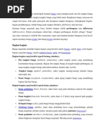 5. Bagian-bagian yang bersifat seperti batang, misalnya: Ibu tangkai bunga (peduncle, pedunculus) Tangkai bunga Dasar bunga (receptacle, receptaculum) 6. Bagian-bagian yang bersifat seperti daun, misalnya: Daun pelindung (bract, bractea) Daun tangkai (bracteole, bracteola) Kelopak bunga (calyx) Seludang bunga (spatha) Daun pembalut (involucre, involucrum) Daun kelopak tambahan (epicalyx) 7. Berdasarkan pertumbuhan pucuknya : Bunga majemuk tidak terbatas (indeterminate): pertumbuhan monopodial. Pucuk ibu tangkai bunga tumbuh terus, dan bunga-bunga mekar dari bawah ke atas. Bunga majemuk terbatas (determinate) 8. Beberapa bentuk peralihan yang meragukan dihilangkan di sini. Tandan (raceme, racemus, botrys) Bulir (spike, spica) Bunga cawan (corymb, corymbus) Bunga payung (umbel, umbella) Tongkol (spadix) Bongkol (capitulum) Untai (catkin, ament, amentum) 9. Suatu rumus bunga dapat ditunjukkan hal-hal mengenai 4 bagian pokok bunga sebagai berikut: Kelopak, yang dinyatakan dengan huruf K singaktan kata kalix (calix), yang merupakan istilah ilmiah untuk kelopak. Tajuk atau mahkota, yang dinyatakan dengan huruf C singkatan kata corolla (istilah untuk mahkota bunga) Benang-benang sari yang dinyatakan dengan huruf A singkatan kata androecium (istilah ilmiah untuk alat-alat jantan pada bunga) Putik yang dinyatakan dengan huruf G singakatan kata gymnaecium (istilah untuk alat betina pada bunga)