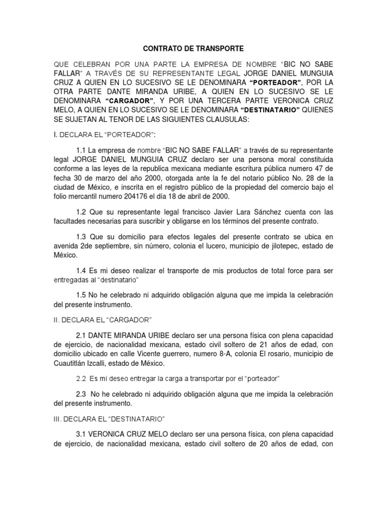 JORGE DANIEL MUNGUIA CRUZ A QUIEN EN LO SUCESIVO SE LE DENOMINARA “PORTEADOR”, POR LA OTRA PARTE DANTE MIRANDA URIBE, A QUIEN EN LO SUCESIVO SE LE DENOMINARA “CARGADOR”, Y POR UNA TERCERA PARTE VERONICA CRUZ MELO, A QUIEN EN LO SUCESIVO SE LE DENOMINARA “DESTINATARIO” QUIENES SE SUJETAN AL TENOR DE LAS SIGUIENTES CLAUSULAS: I. DECLARA EL “PORTEADOR”: 1.1 La empresa de nombre “BIC NO SABE FALLAR” a través de su representante legal JORGE DANIEL MUNGUIA CRUZ declaro ser una persona moral constituida conforme a las leyes de la republica mexicana mediante escritura pública numero 47 de fecha 30 de marzo del año 2000, otorgada ante la fe del notario público No. 28 de la ciudad de México, e inscrita en el registro público de la propiedad del comercio bajo el folio mercantil numero 204176 el día 18 de abril de 2000. 1.2 Que su representante legal francisco Javier Lara Sánchez cuenta con las facultades necesarias para suscribir y obligarse en los términos del presente contrato. 1.3 Que su domicilio para efectos legales del presente contrato se ubica en avenida 2de septiembre, sin número, colonia el lucero, municipio de jilotepec, estado de México. 1.4 Es mi deseo realizar el transporte de mis productos de total force para ser entregadas al “destinatario” 1.5 No he celebrado ni adquirido obligación alguna que me impida la celebración del presente instrumento. II. DECLARA EL “CARGADOR” 2.1 DANTE MIRANDA URIBE declaro ser una persona física con plena capacidad de ejercicio, de nacionalidad mexicana, estado civil soltero de 21 años de edad, con domicilio ubicado en calle Vicente guerrero, numero 8-A, colonia El rosario, municipio de Cuautitlán Izcalli, estado de México. 2.2 Es mi deseo entregar la carga a transportar por el “porteador” 2.3 No he celebrado ni adquirido obligación alguna que me impida la celebración del presente instrumento. III. DECLARA EL “DESTINATARIO” 3.1 VERONICA CRUZ MELO declaro ser una persona física, con plena capacidad de ejercicio, de nacionalidad mexicana, estado civil soltero de 20 años de edad, con