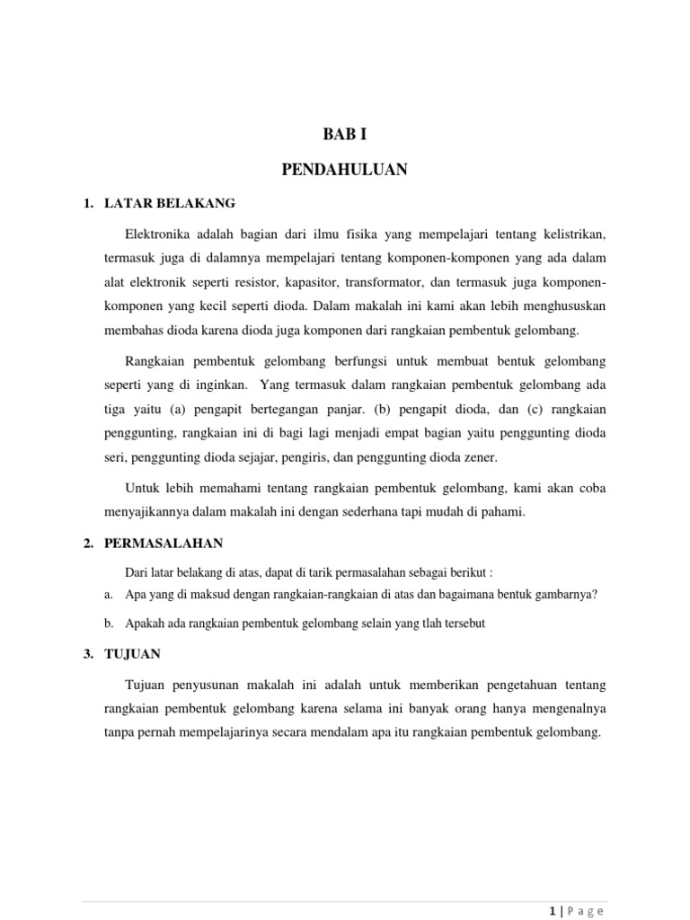 1. LATAR BELAKANG Elektronika adalah bagian dari ilmu fisika yang mempelajari tentang kelistrikan, termasuk juga di dalamnya mempelajari tentang komponen-komponen yang ada dalam alat elektronik seperti resistor, kapasitor, transformator, dan termasuk juga komponenkomponen yang kecil seperti dioda. Dalam makalah ini kami akan lebih menghususkan membahas dioda karena dioda juga komponen dari rangkaian pembentuk gelombang. Rangkaian pembentuk gelombang berfungsi untuk membuat bentuk gelombang seperti yang di inginkan. Yang termasuk dalam rangkaian pembentuk gelombang ada tiga yaitu (a) pengapit bertegangan panjar. (b) pengapit dioda, dan (c) rangkaian penggunting, rangkaian ini di bagi lagi menjadi empat bagian yaitu penggunting dioda seri, penggunting dioda sejajar, pengiris, dan penggunting dioda zener. Untuk lebih memahami tentang rangkaian pembentuk gelombang, kami akan coba menyajikannya dalam makalah ini dengan sederhana tapi mudah di pahami. 2. PERMASALAHAN