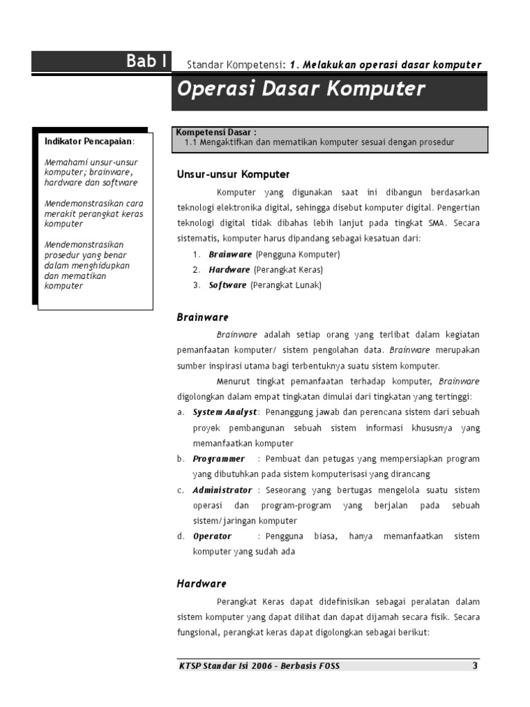 Indikator Pencapaian: Memahami unsur-unsur komputer; brainware, hardware dan software Mendemonstrasikan cara merakit perangkat keras komputer Mendemonstrasikan prosedur yang benar dalam menghidupkan dan mematikan komputer Kompetensi Dasar : 1.1 Mengaktifkan dan mematikan komputer sesuai dengan prosedur