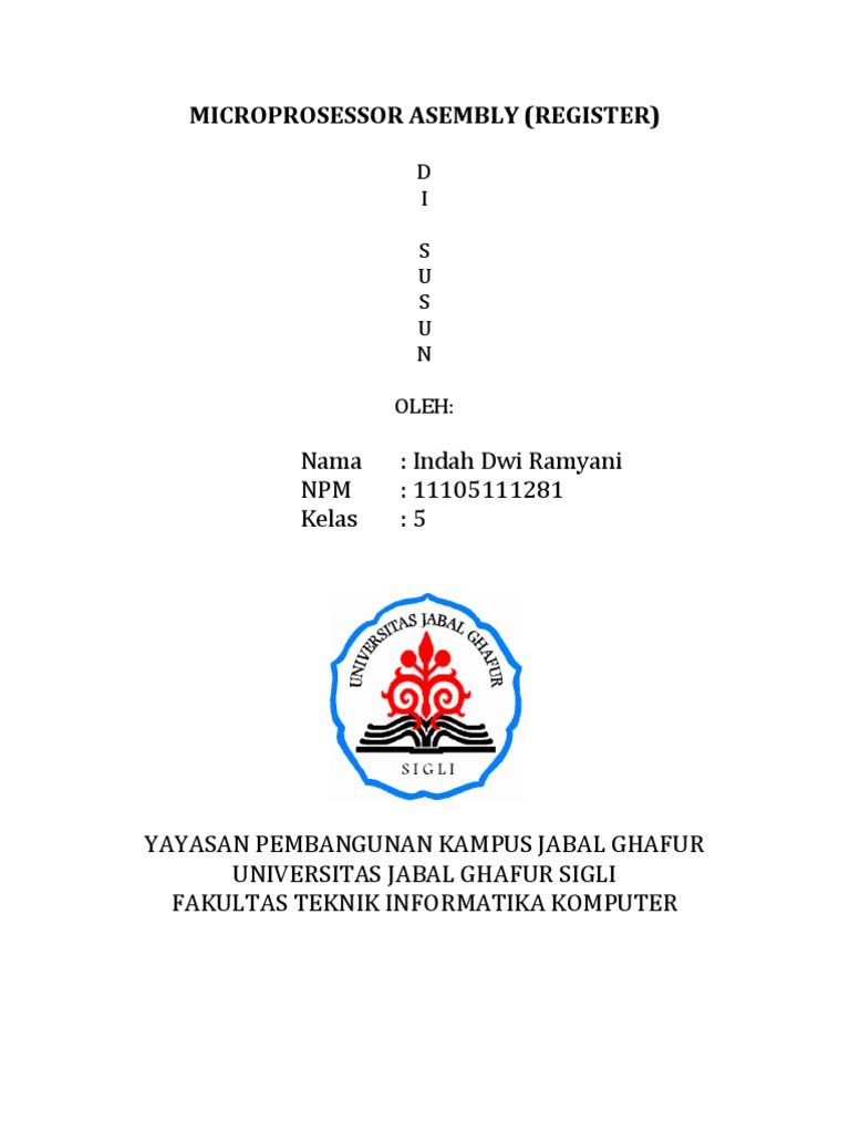 1.3 INSTRUKSI-INSTRUKSI MIKROPROSESOR Untuk dapat mempergunakan serta memanfaatkan sebuah mikroprosesor, kita harus mengenal terlebih dahulu instruksi-instruksi yang bias dijalankan oleh mikroprosesor yang bersangkutan.Karena pada hakekatnya, seluruh kemampuan yang ada pada mikroprosesor terletak pada kecanggihan perintah-perintah yang terdapat didalamnya.Tanpa adanya instruksi-instruksi yang membentuk sebuah program, mikroprosesor tidak lebih hanya merupakan serpihan tanpa guna.Setiap mikroprosesor mempunyai perbendaharaan instruksi sendiri-sendiri, yang disebut dengan 'Set Instruksi' atau 'Instruction Set'. 1.4 Operasi, Operator dan Operand Pada dasarnya mikroprosesor mampu melakukan beberapa jenis operasi, antara lain operasi perhitungan (arithmetic), operasilogika (logical operation), operasi transfer data (data transfer operation), manipulasi string serta kendali prosesor.Masing-masing jenis instruksi tersebuta dalah sebagai berikut : a. Perhitungan ADD (penjumlahan), SUB (pengurangan), MUL (perkalian), DIV (pembagian) b. Logika AND (logika DAN), OR (logika OR), XOR (logika Exclusive OR) c. Transfer Data MOV (pindahkan/salin), IN (Input), OUT (Output), dansebagainya. d. Transfer Kendali JMP (loncat), CALL (panggil), RET (kembali), INT (interupsi), dsb e. Manipulasi String MOVS (pindahkan/salin string), CMPS (bandingkan string), LODS (muatkanbyte/word ke register AX), dansebagainya. f. KendaliProsesor CLC (hilangkanbawaan/carry), CLI (hilangkaninterupsi), dansebagainya. Pada instruksi-instruksi komputeri, operator diterapkan sebagai Operation-Code (Op-Code), sedangkan bilangan disebut Operand (adalah obyek dari suatu operasi). 1.5 Operasi Transfer Data 1. Pemindahan data dari data register ke register Format : MOV register, register Contoh : -a 0100 (enter) xxxx : 0100 mov AX,DX (enter) xxxx : 0102 (enter)