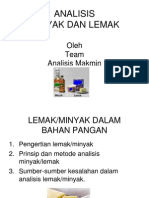 Iodine Value Iodine Value adalah suatu besaran untuk mengukur derajat ketidakjenuhan dalam asam lemak. Ini dinyatakan dengan jumlah gram iodine yang diserap oleh 100 g lemak. Bilangan iodine tergantung pada jumlah asam lemak tidak jenuh dalam minyak. Lemak yang akan diperiksa dilarutkan dalam iso oktan kemudian ditambahkan larutan Iodine berlebih, sisa iodine yang tidak bereaksi dititrasi dengan Na. thiosulfat. Spesifikasi > 50. Penentuan bilangan iodin biasanya menggunakan cara Hanus, Kaufmann dan