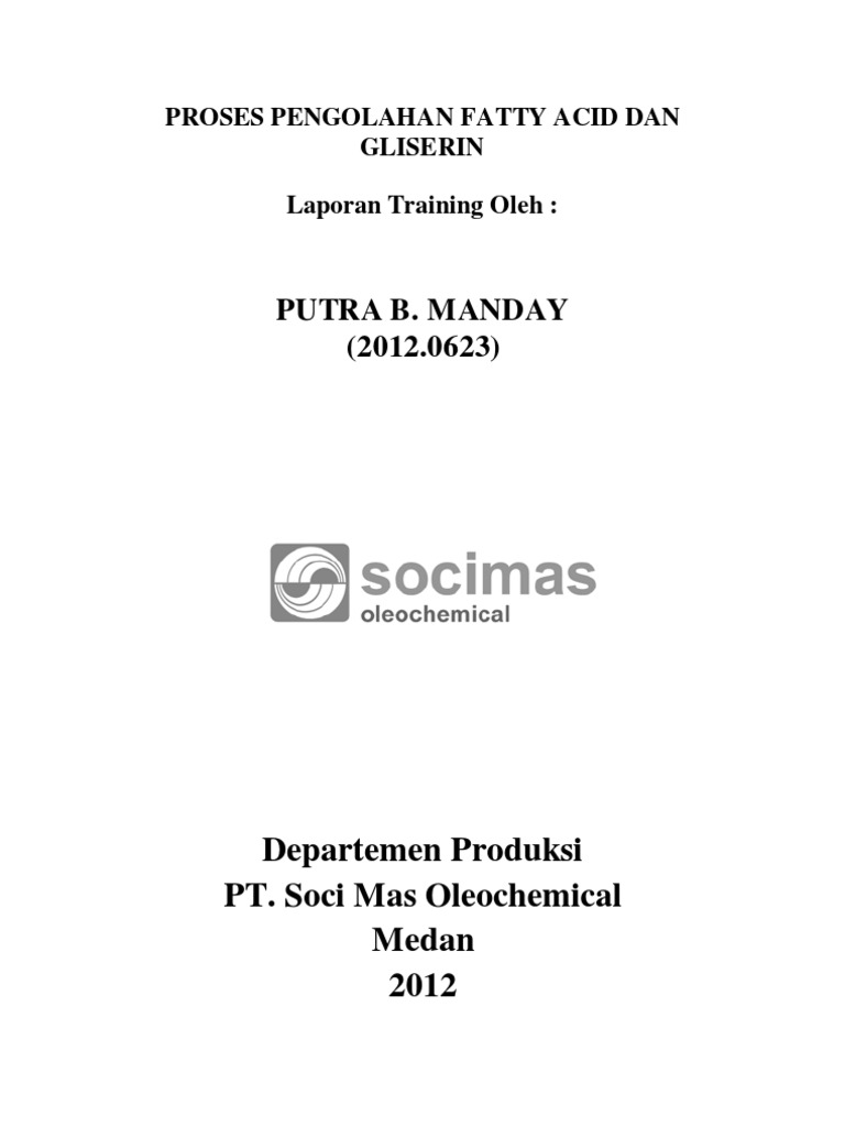 I. Proses Pengolahan Fatty Acid (Asam Le mak) di PT. SOCIMAS A. Proses Hidrolisa (Splitting #100 dan #400) Proses Hidrolisa (Splitting) adalah pemisahan Fatty Acid (asam lemak) dan gliserin dari minyak (trigliserida) yang direaksikan dengan air dan akan memperoleh hasil samping berupa Free Fatty Acid, Gliserin Mono dan Digliserida yang dapat dihilangkan melalui proses destilasi. Perbedaan minyak dengan lemak : Lemak Lemak adalah suatu gliserida dan merupakan suatu ester. Apabila ester ini bereaksi dengan basa maka akan terjadi saponifikasi yaitu proses terbentuknya sabun dengan residu gliserol. Sabun dalam air akan bersifat basa. Lemak pada suhu kamar berbentuk padat (density 0.8 gr/cm3 ), jumlah asam lemak jenuh lebih besar dari asam lemak tak jenuh dan memiliki ikatan rangkap sedikit. Gliserida dari hewan berupa lemak (lemak hewani). Minyak Minyak pada suhu kamar berbentuk cair (density 0.91-0.94 gr/cm3 ), jumlah asam lemak jenuh lebih sedikit dari asam lemak tak jenuh dan memiliki ikatan rangkap lebih banyak. Gliserida dari tumbuhan berupa minyak (minyak nabati). 3 molekul trigliserida mengandung 3 molekul asam lemak, Reaksi Hidrolisa (Splittng section) O || C O || C O || C O || C O || C O || C