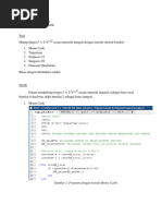 c) Contoh Program pada MATLAB Contoh untuk fungsi ( ) [ ] clc; clear; a=0 ('Batas bawah a = '); b=2('Batas atas b = '); y=inline (2+cos(2*x^0.5)); n=16('Jumlah interval n = '); h=(b-a)/n; h1=h/2; j1=subs(y,x,a); j2=subs(y,x,b); jml=j1+j2; t=h; for i=1:(n-1) j3=(b-a)*subs(y,x,t); jml=jml+j3; t=t+h; end; hsl=jml*h1; disp('Hasil ='); disp(hsl); Output untuk listing diatas : Batas bawah a = 0 Batas atas b = 2 Fungsi y = 2+cos(2*x^0.5) Jumlah interval m = 16 Hasil = 3.4623