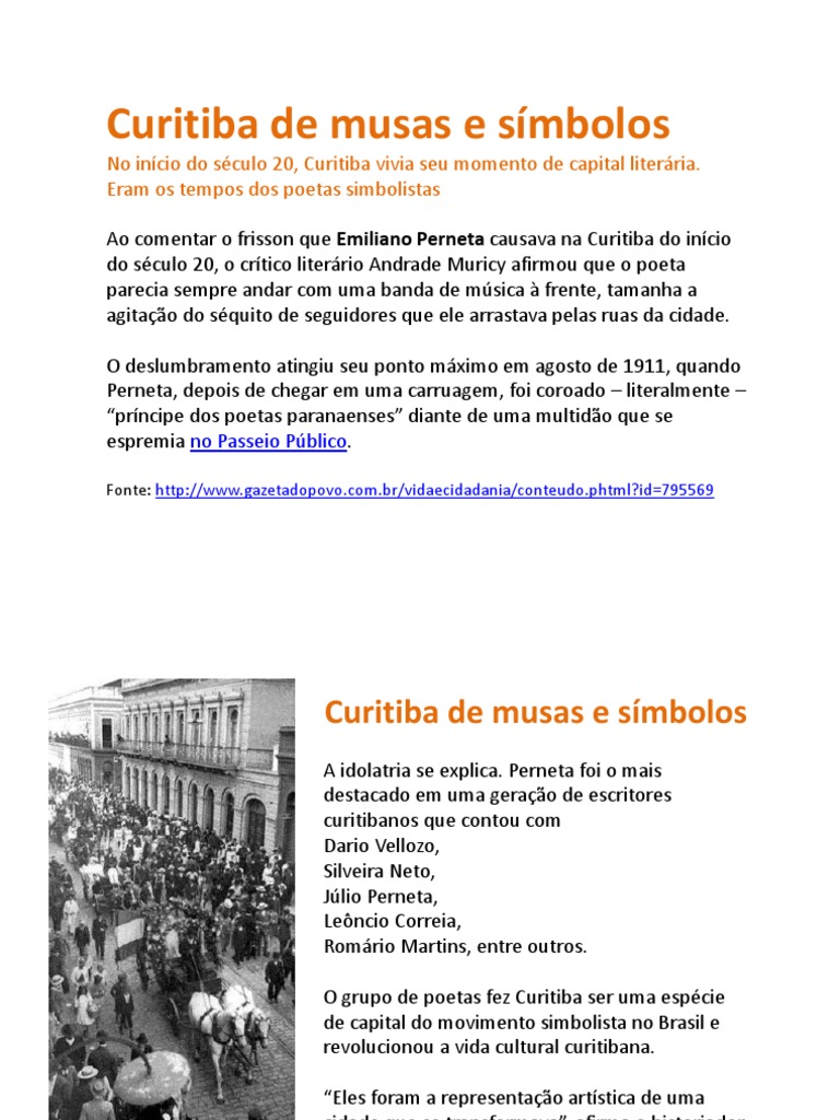 No incio do sculo 20, Curitiba vivia seu momento de capital literria. Eram os tempos dos poetas simbolistas Ao comentar o frisson que Emiliano Perneta causava na Curitiba do incio do sculo 20, o crtico literrio Andrade Muricy afirmou que o poeta parecia sempre andar com uma banda de msica frente, tamanha a agitao do squito de seguidores que ele arrastava pelas ruas da cidade. O deslumbramento atingiu seu ponto mximo em agosto de 1911, quando Perneta, depois de chegar em uma carruagem, foi coroado literalmente prncipe dos poetas paranaenses diante de uma multido que se espremia no Passeio Pblico.