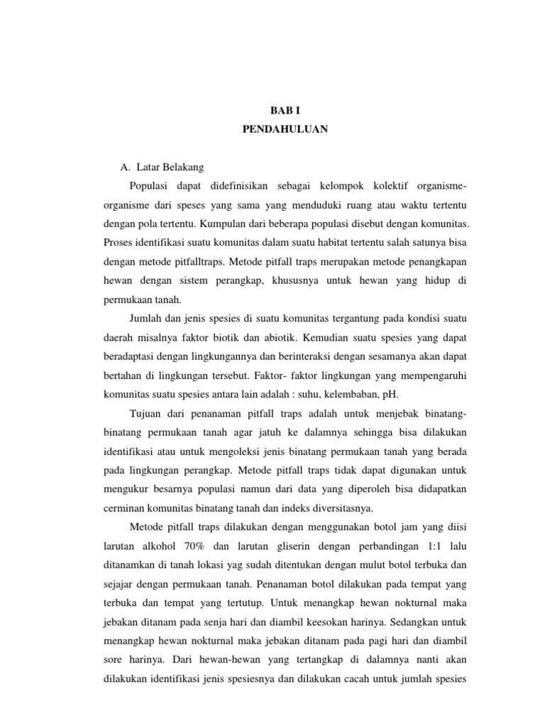 A. Latar Belakang Populasi dapat didefinisikan sebagai kelompok kolektif organismeorganisme dari speses yang sama yang menduduki ruang atau waktu tertentu dengan pola tertentu. Kumpulan dari beberapa populasi disebut dengan komunitas. Proses identifikasi suatu komunitas dalam suatu habitat tertentu salah satunya bisa dengan metode pitfalltraps. Metode pitfall traps merupakan metode penangkapan hewan dengan sistem perangkap, khususnya untuk hewan yang hidup di permukaan tanah. Jumlah dan jenis spesies di suatu komunitas tergantung pada kondisi suatu daerah misalnya faktor biotik dan abiotik. Kemudian suatu spesies yang dapat beradaptasi dengan lingkungannya dan berinteraksi dengan sesamanya akan dapat bertahan di lingkungan tersebut. Faktor- faktor lingkungan yang mempengaruhi komunitas suatu spesies antara lain adalah : suhu, kelembaban, pH. Tujuan dari penanaman pitfall traps adalah untuk menjebak binatangbinatang permukaan tanah agar jatuh ke dalamnya sehingga bisa dilakukan identifikasi atau untuk mengoleksi jenis binatang permukaan tanah yang berada pada lingkungan perangkap. Metode pitfall traps tidak dapat digunakan untuk mengukur besarnya populasi namun dari data yang diperoleh bisa didapatkan cerminan komunitas binatang tanah dan indeks diversitasnya. Metode pitfall traps dilakukan dengan menggunakan botol jam yang diisi larutan alkohol 70% dan larutan gliserin dengan perbandingan 1:1 lalu ditanamkan di tanah lokasi yag sudah ditentukan dengan mulut botol terbuka dan sejajar dengan permukaan tanah. Penanaman botol dilakukan pada tempat yang terbuka dan tempat yang tertutup. Untuk menangkap hewan nokturnal maka jebakan ditanam pada senja hari dan diambil keesokan harinya. Sedangkan untuk menangkap hewan nokturnal maka jebakan ditanam pada pagi hari dan diambil sore harinya. Dari hewan-hewan yang tertangkap di dalamnya nanti akan dilakukan identifikasi jenis spesiesnya dan dilakukan cacah untuk jumlah spesies