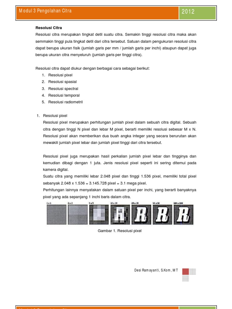 citra dengan tinggi N pixel dan lebar M pixel, berarti memiliki resolusi sebesar M x N.