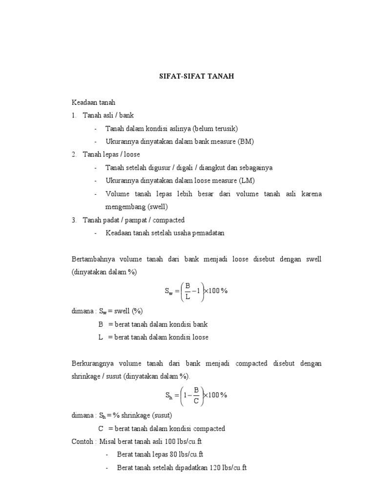 Maka 100 Sw = 1 100 % = 25 % 80 100 S h = 1 100 % = 16,67 % 120 Keadaan tanah juga dapat dinyatakan dalam load factor dan shrinkage factor. Load factor = volume keadaan bank volume keadaan loose volume keadaan compacted volume keadaan bank