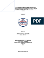 Dilakukan dengan cara destilasi Cara penetapan : Tabung penerima dan pendingin dibersihkan. Ke dalam labu kering dimasukkan sejumlah bahan yang diperkirakan mengandung 1 sampai 4 ml air. Masukkan lebih kurang 200 ml toluen P yang telah dijenuhkan dengan air dimasukkan ke dalam labu. Tuangkan toluen ke dalam tabung penerima melalui alat pendingin. Labu dipanaskan hati-hati selama 15 menit atau hingga destilasi sempurna. Setelah air dan toluene memisah sempurna volume air yang tertampung dibaca. Kadar air dihitung dalam % v/b. P. Destilasi minyak atsiri rimpang kunyit Sebanyak 2 kg simplisia rimpang kunyit diletakkan diatas penyekat berpori dalam dandang berisi air lalu dipasang kondensor yang telah dilengkapi dengan alat penampung minyak atsiri. Kemudian dandang dipanaskan hingga minyak atsiri terdestilisir, minyak ditampung dalam alat penampung dan pemanasan dilakukan sampai tidak ada lagi minyak yang menetes setelah itu minyak diambil dan dimasukkan dalam corong pisah. Saring minyak atsiri dengan natrium sulfat anhidrat, masukkan minyak dalam flakon dilapisi alumunium foil. Q. a. Penetapan kadar Kurkumin Totolkan masing-masing 25 L larutan uji dan enceran Larutan pembanding pada silika gel 60 F254, kembangkan dengan fase gerak n-heksan P-etilasetat P (1:1), ukur secara kromatografi lapis tipis-densitometri, pada panjang gelombang 425 nm. b. Minyak atsiri Hasil destilasi dibaca dengan menggunakan GC-MS di laboratorium analisis Farmasi UGM.