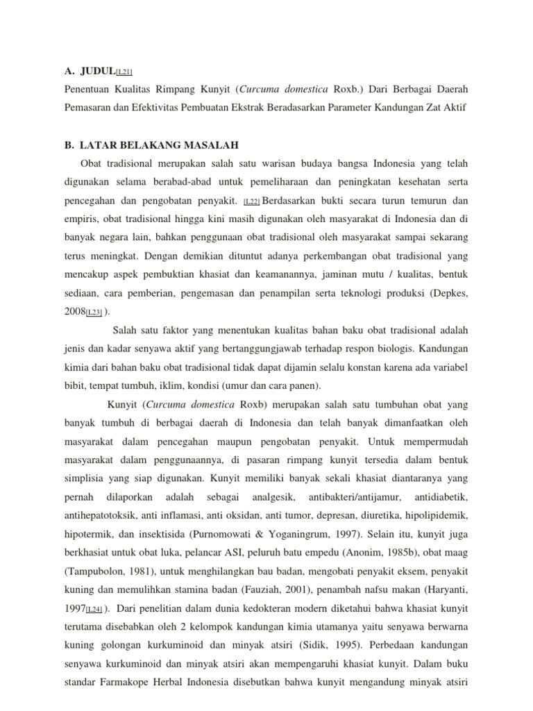 F. KEGUNAAN 1. Peneliti Dapat mengembangkan kreativitas [L28] dan memperluas khasanah keilmuan mahasiswa, serta sebagai salah satu wahana untuk meningkatkan keterampilan dan kemampuan mahasiswa dalam melakukan penelitian. 2. Masyarakat Dapat mendorong masyarakat dalam usaha peningkatan kualitas rimpang kunyit yang baik dan sesuai persyaratan. Serta dapat memberikan informasi dalam mendapatkan rimpang kunyit yang baik. 3. Kaum cendekia Mendasari penelitian lebih lanjut tentang kualitas rimpang kunyit yang beredar di pasaran daerah lain. 4. Industri Memberikan informasi bagi industri obat tradisional mengenai kualitas rimpang kunyit yang memenuhi persyaratan sesuai Farmakope Herbal Indonesia.