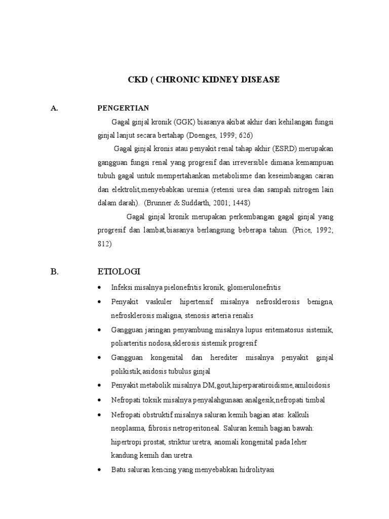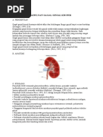 A. PENGERTIAN Gagal ginjal kronik (GGK) biasanya akibat akhir dari kehilangan fungsi ginjal lanjut secara bertahap (Doenges, 1999; 626) Gagal ginjal kronis atau penyakit renal tahap akhir (ESRD) merupakan gangguan fungsi renal yang progresif dan irreversible dimana kemampuan tubuh gagal untuk mempertahankan metabolisme dan keseimbangan cairan dan elektrolit,menyebabkan uremia (retensi urea dan sampah nitrogen lain dalam darah). (Brunner & Suddarth, 2001; 1448) Gagal ginjal kronik merupakan perkembangan gagal ginjal yang progresif dan lambat,biasanya berlangsung beberapa tahun. (Price, 1992; 812)