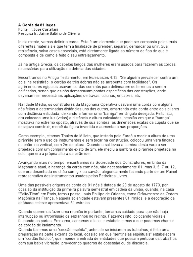 Avançando mais no tempo, encontramos na Sociedade dos Construtores, embrião da Maçonaria atual, a herança da corda com nós, não necessariamente 81, mas 3, 5, 7 ou 12, que era desenhada no chão com giz ou carvão, alegoricamente fazendo parte de um Painel representativo dos instrumentos usados pelos Pedreiros Livres.