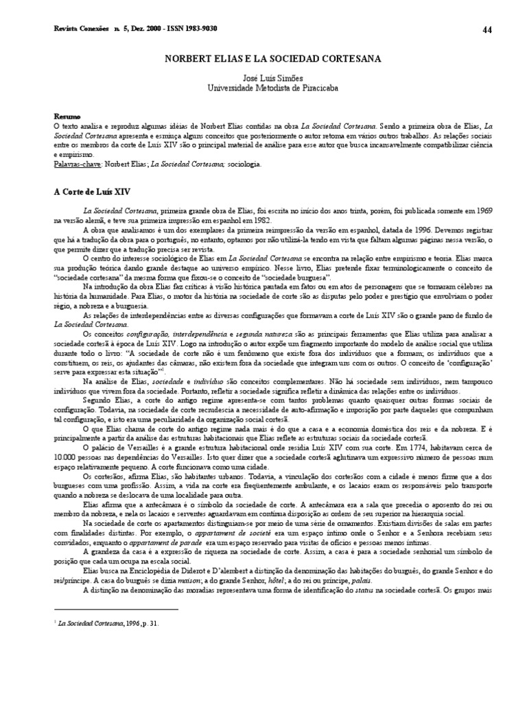 The text analyze and reproduce some ideas of the Norbert Elias contained in the work La Sociedad Cortesana. How Eliass first work, La Sociedad Cortesana present and examine some concepts what subsequently the author retake in very others works. The socials relations among the court members of the Lus XIV are the principal material of analyze to that author what indefatigable search to compatible science and empiricism. Key words: Norbert Elias; La Sociedad Cortesana; sociology.