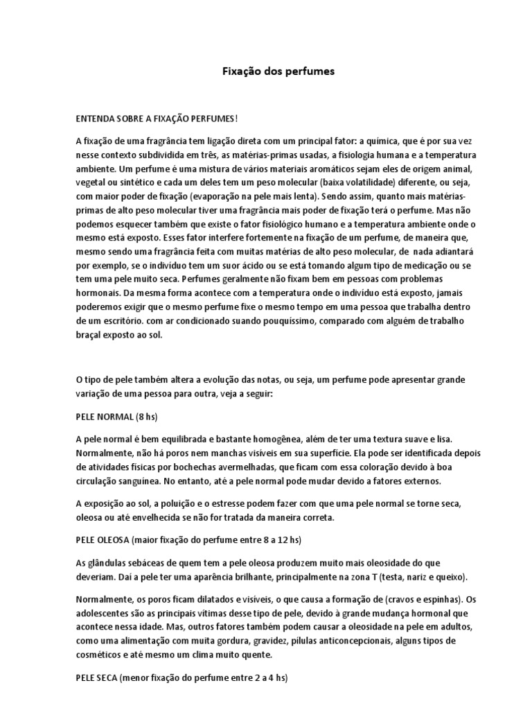 ENTENDA SOBRE A FIXAO PERFUMES! A fixao de uma fragrncia tem ligao direta com um principal fator: a qumica, que por sua vez nesse contexto subdividida em trs, as matrias-primas usadas, a fisiologia humana e a temperatura ambiente. Um perfume uma mistura de vrios materiais aromticos sejam eles de origem animal, vegetal ou sinttico e cada um deles tem um peso molecular (baixa volatilidade) diferente, ou seja, com maior poder de fixao (evaporao na pele mais lenta). Sendo assim, quanto mais matriasprimas de alto peso molecular tiver uma fragrncia mais poder de fixao ter o perfume. Mas no podemos esquecer tambm que existe o fator fisiolgico humano e a temperatura ambiente onde o mesmo est exposto. Esses fator interfere fortemente na fixao de um perfume, de maneira que, mesmo sendo uma fragrncia feita com muitas matrias de alto peso molecular, de nada adiantar por exemplo, se o indivduo tem um suor cido ou se est tomando algum tipo de medicao ou se tem uma pele muito seca. Perfumes geralmente no fixam bem em pessoas com problemas hormonais. Da mesma forma acontece com a temperatura onde o indivduo est exposto, jamais poderemos exigir que o mesmo perfume fixe o mesmo tempo em uma pessoa que trabalha dentro de um escritrio. com ar condicionado suando pouqussimo, comparado com algum de trabalho braal exposto ao sol.