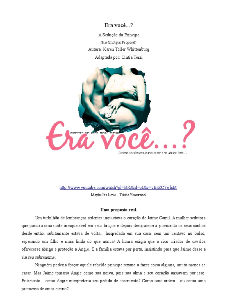 Ele a deitou sobre a cama e beijou-a com paixo. Quero incendiar seu corpo e sentir o calor desse fogo em mim. Caso ainda no tenha percebido, j estou em brasas... O comentrio rouco e sensual alimentou o desejo que o dominava, e Jaime comeou a despi-la e tirar as prprias roupas. At aquele momento agira por impulso, seguro na certeza de que poderia parar antes que as coisas fossem longe demais. Tivera a idia de toc-la para impedir que continuasse chorando. Mantivera o contato fsico por perceber que assim podia distra-la. O plano havia funcionado muito bem, e s no fora perfeito porque o feitio se voltara contra o feiticeiro. Agora era ele quem estava distrado. Confuso. Perdido. Perdera-se na tentativa de assumir o papel do protetor, e de repente sentia uma necessidade quase vital de ser tocado por Angie, de ser beijado e acariciado por ela. E ali estavam eles, prontos para transformarem um engano em dois, dispostos a complicar uma situao que j era muito complexa. Mas algo acontecera no momento em que ela confessara desejlo. Queria Angie, isso era certo, mas sentia algo mais complexo, como se muitas possibilidades se descortinassem repentinamente diante de seus olhos. Talvez Cade tivesse razo. Angie no era Gillan. No estava ali para engan-lo, mas para am-lo, para ser desejvel e sedutora em seus braos. Talvez no tivesse certeza de seus motivos, e certamente no se sentia pronto para dar o grande passo e assumir a paternidade de seu beb. Talvez nunca estivesse, mas seu corao j havia decidido que mereciam uma segunda chance. http://www.youtube.com/watch?v=26PAgklYYvo&ob=av2e