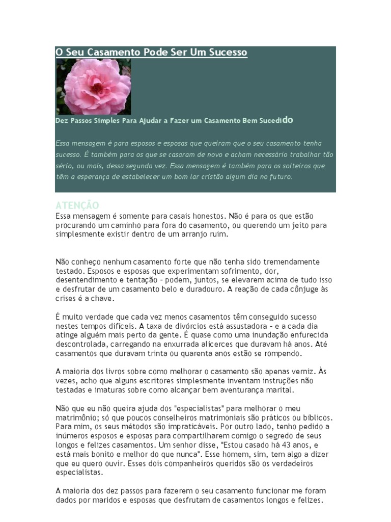 Dez Passos Simples Para Ajudar a Fazer um Casamento Bem Sucedido Essa mensagem para esposos e esposas que queiram que o seu casamento tenha sucesso. tambm para os que se casaram de novo e acham necessrio trabalhar to srio, ou mais, dessa segunda vez. Essa mensagem tambm para os solteiros que tm a esperana de estabelecer um bom lar cristo algum dia no futuro.