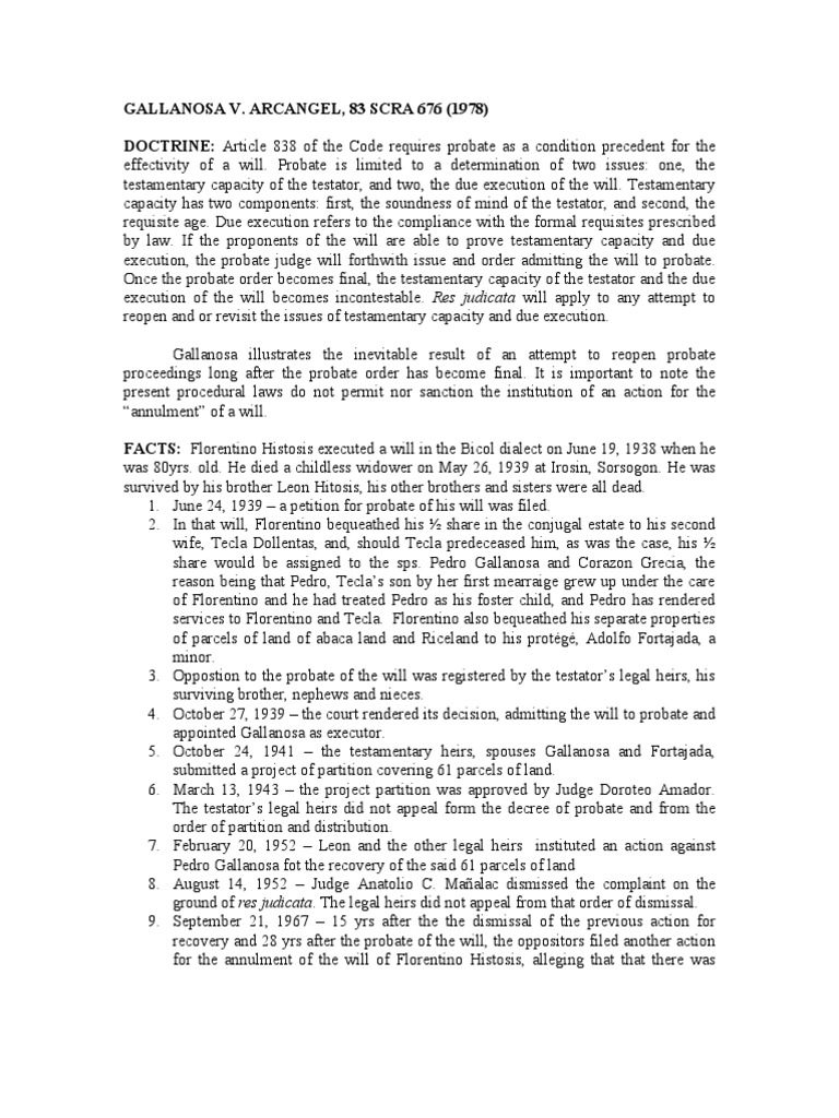 ARCANGEL, 83 SCRA 676 (1978) DOCTRINE: Article 838 of the Code requires probate as a condition precedent for the effectivity of a will. Probate is limited to a determination of two issues: one, the testamentary capacity of the testator, and two, the due execution of the will. Testamentary capacity has two components: first, the soundness of mind of the testator, and second, the requisite age. Due execution refers to the compliance with the formal requisites prescribed by law. If the proponents of the will are able to prove testamentary capacity and due execution, the probate judge will forthwith issue and order admitting the will to probate. Once the probate order becomes final, the testamentary capacity of the testator and the due execution of the will becomes incontestable. Res judicata will apply to any attempt to reopen and or revisit the issues of testamentary capacity and due execution. Gallanosa illustrates the inevitable result of an attempt to reopen probate proceedings long after the probate order has become final. It is important to note the present procedural laws do not permit nor sanction the institution of an action for the “annulment” of a will. FACTS: Florentino Histosis executed a will in the Bicol dialect on June 19, 1938 when he was 80yrs. old. He died a childless widower on May 26, 1939 at Irosin, Sorsogon. He was survived by his brother Leon Hitosis, his other brothers and sisters were all dead. 1. June 24, 1939 – a petition for probate of his will was filed. 2. In that will, Florentino bequeathed his ½ share in the conjugal estate to his second wife, Tecla Dollentas, and, should Tecla predeceased him, as was the case, his ½ share would be assigned to the sps. Pedro Gallanosa and Corazon Grecia, the reason being that Pedro, Tecla’s son by her first mearraige grew up under the care of Florentino and he had treated Pedro as his foster child, and Pedro has rendered services to Florentino and Tecla. Florentino also bequeathed his separate properties of parcels of land of abaca land and Riceland to his protégé, Adolfo Fortajada, a minor. 3. Oppostion to the probate of the will was registered by the testator’s legal heirs, his surviving brother, nephews and nieces. 4. October 27, 1939 – the court rendered its decision, admitting the will to probate and appointed Gallanosa as executor. 5. October 24, 1941 – the testamentary heirs, spouses Gallanosa and Fortajada, submitted a project of partition covering 61 parcels of land. 6. March 13, 1943 – the project partition was approved by Judge Doroteo Amador. The testator’s legal heirs did not appeal form the decree of probate and from the order of partition and distribution. 7. February 20, 1952 – Leon and the other legal heirs instituted an action against Pedro Gallanosa fot the recovery of the said 61 parcels of land 8. August 14, 1952 – Judge Anatolio C. Mañalac dismissed the complaint on the ground of res judicata. The legal heirs did not appeal from that order of dismissal. 9. September 21, 1967 – 15 yrs after the the dismissal of the previous action for recovery and 28 yrs after the probate of the will, the oppositors filed another action for the annulment of the will of Florentino Histosis, alleging that that there was