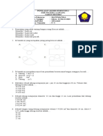 Jika panjang salah satu diagonal sisi sebuah kubus 50 cm, maka luas sisi kubus itu adalah . a. 1.500 cm2 c. 7.500 cm2 2 b. 3.000 cm d. 15.000 cm2 2. Budi mempunyai kawat sepanjang 24 meter. Ia akan membuat kerangka balok yang berukuran 15 cm x 12 cm x 13 cm. Banyak kerangka balok yang dapat dibuat adalah . buah. a. 10 c. 15 b. 12 d. 25 3. Banyaknya rusuk suatu prisma tegak yang alasnya segilima beraturan adalah . buah a. 10 c. 15 b. 12 d. 18 4. Banyaknya sisi suatu prisma segienam adalah . buah. a. 5 c. 7 b. 6 d. 8 5. Volume prisma yang alasnya segitiga sama kaki dengan panjang kaki yang sama 13 cm, panjang sisi yang lain 10 cm, tinggi prisma 15 cm adalah . a. 780 cm3 c. 975 cm3 3 b. 900 cm d. 1800 cm3 6. Sebuah prisma tegak, alasnya berbentuk segitiga siku-siku dengan ukuran sisinya 3 cm, 4 cm dan 5 cm. Jika tinggi prsima 12 cm, maka luas permukaan prisma adalah . a. 72 cm2 c. 120 cm2 2 b. 90 cm d. 156 cm2 22 7. Volume tabung yang berjari-jari 3,5 cm dengan tinggi 10 cm dan = adalah . 7 a. 110 cm3 c. 385 cm3 b. 220 cm3 d. 770 cm3 22 8. Sebuah tabung mempunyai luas selimut 440 cm2, tinggi 10 cm dan = . Volume 7 tabung tersebut adalah . a. 440 cm3 c. 1540 cm3 3 b. 770 cm d. 3080 cm3 9. Volume sebuah tabung 1540 cm3. Bila jari-jari tabung 7 cm, maka luas sisi tabung tertutup itu adalah . a. 748 cm2 c. 875 cm2 2 b. 785 cm d. 885 cm2